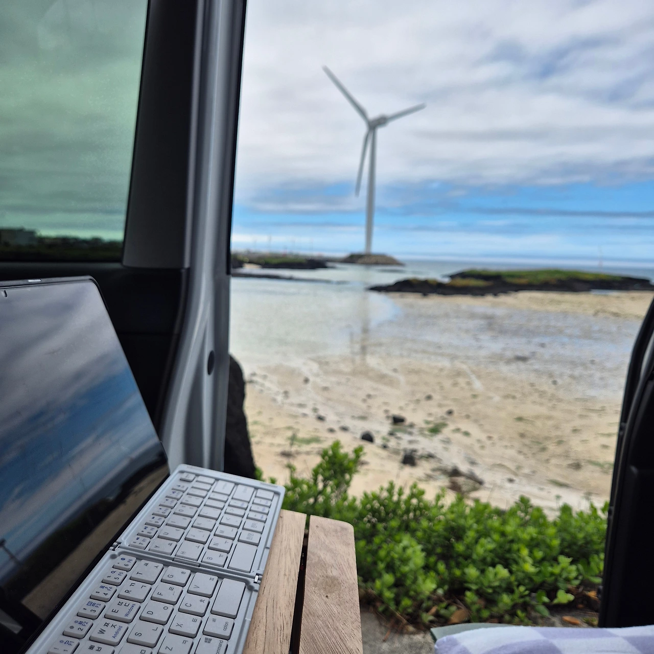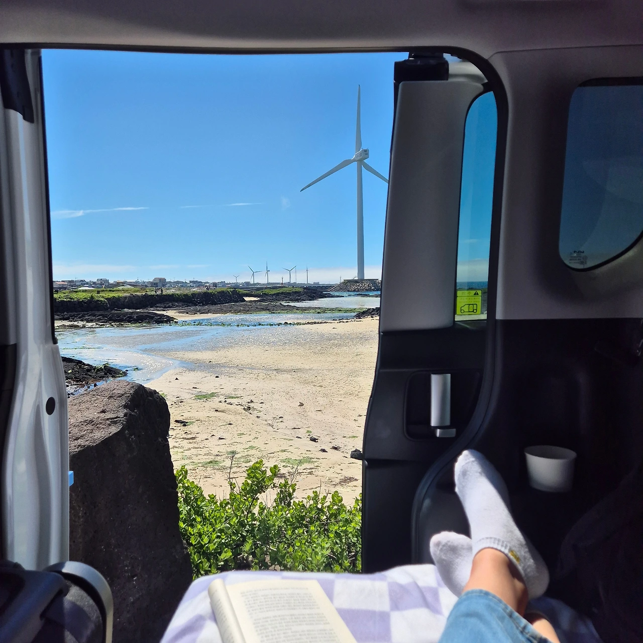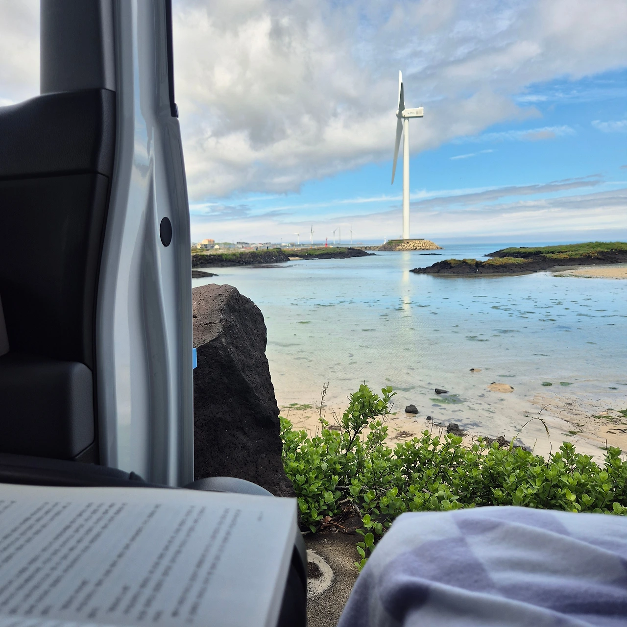 그리고 세번째 바퀴달린 책방지는 '코난비치'. 객실정비 시간 때문에 어짜피 나가야 했는데, 준비가 일찍 끝나 10시 조금 넘은 시간부터 나는 제주동쪽의 해안도로를 달리고 있었다. 어제 갔던 함덕서우봉 주차장이 너무 좋았기에 다시 그리로 갈까 하다가 '어? 여기 괜찮은데?' 하고 멈추었다. 그곳이 코난비치였다. 내가 도착했을 때 아무도 없어서 여기가 핫한 곳인 줄 전혀 알지 못했다. 주차하고 보니 그곳이었고, 얼마 지나지 않아 내 근처로 차들이 빽빽이 들어찼다. 1등으로 도착해 내 입맛대로 주차한 내 자리는 오늘도 명당이었다.