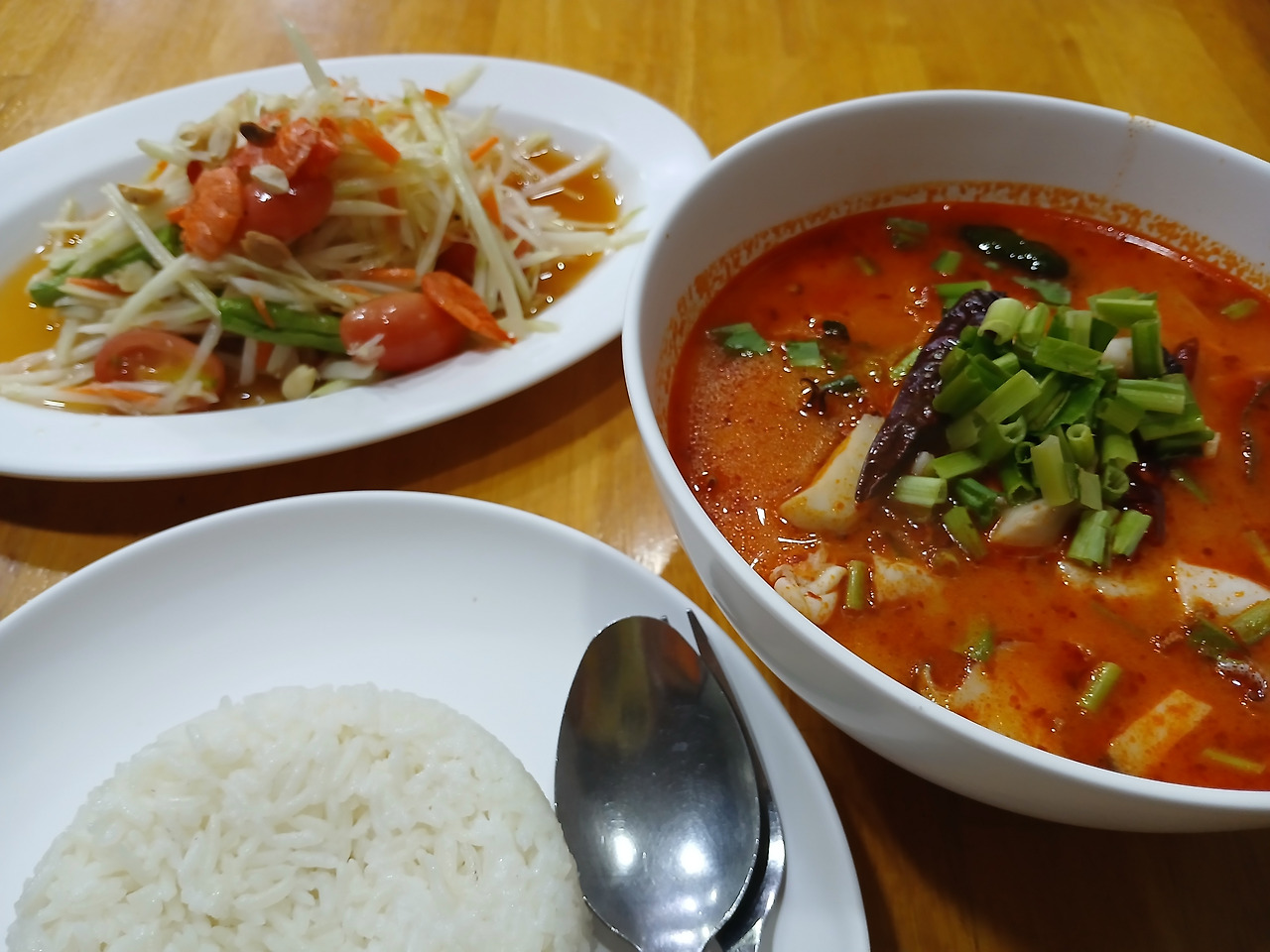 메뉴는 다양했지만, 나는 파파야 샐러드와 여러 해산물이 들어간 똠얌꿍, 그리고 밥 한 공기를 주문했다.