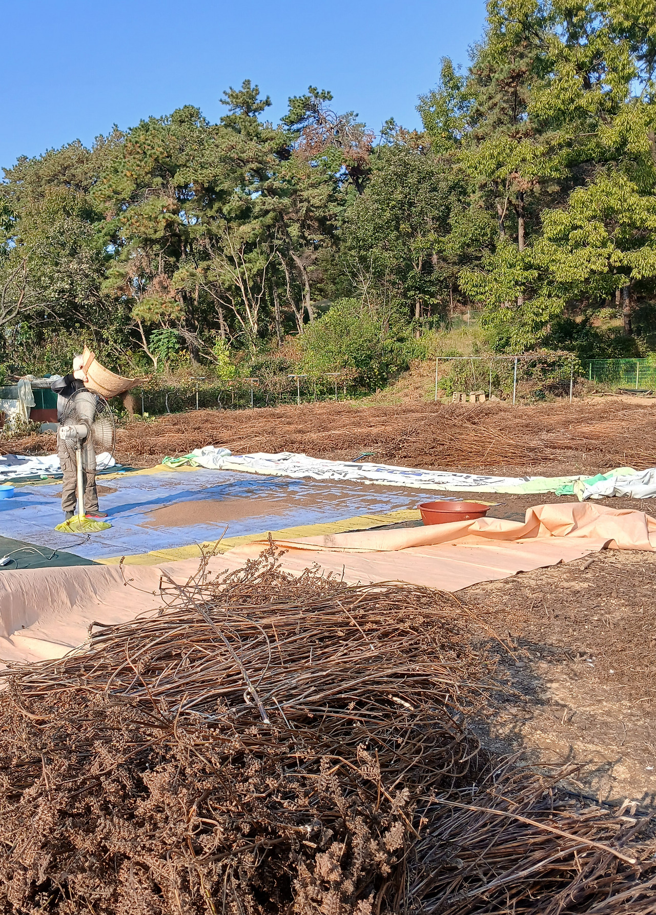베어낸 깻단을 눕혀 햇볕에 말리는 데에는 열흘 정도가 필요한데, 이때는 날씨가 정말 중요하다.