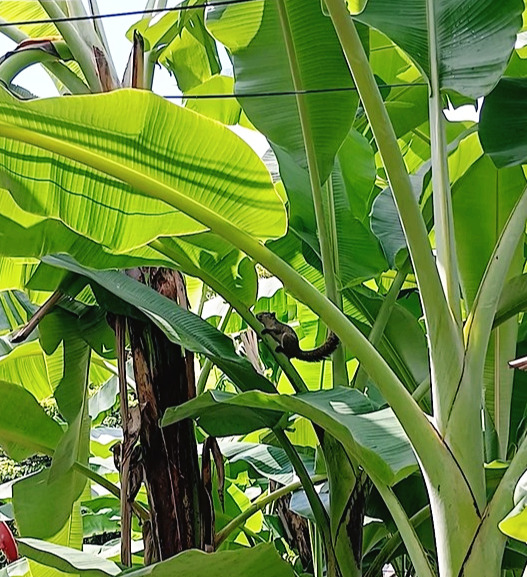 몇 걸음 더 옮기자, 이번에는 상당히 높게 자란 바나나 나무 사이를 재빠르게 뛰어다니는 청설모가 보였다.