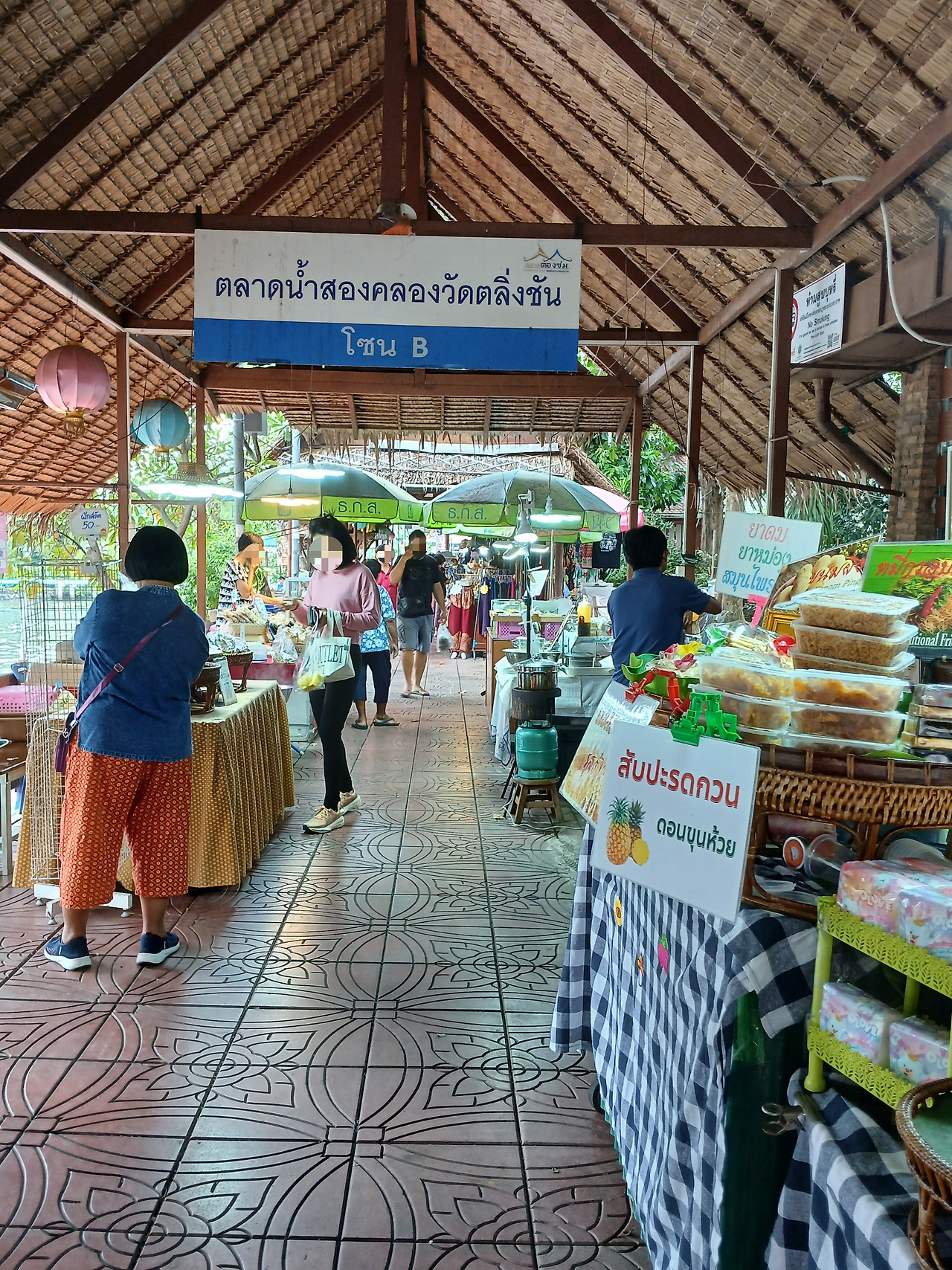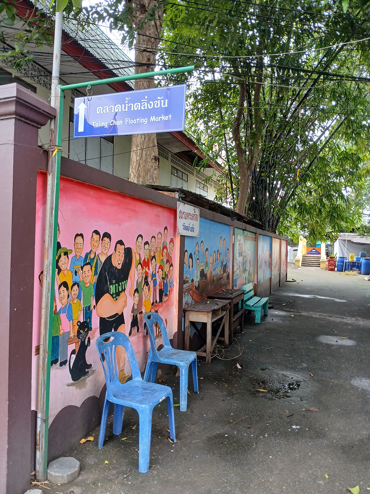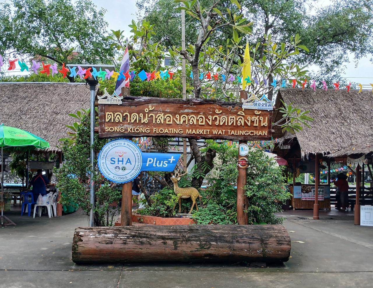 시장이 도로 바로 옆에 위치해 있었으면 눈에 잘 띄었겠지만, 딸링찬 사원(Wat Taling Chan)의 안쪽으로 위치해 있어 찾아 들어가면서도 '내가 맞게 찾아온 건가?' 하는 의구심이 들었지만, 나무에 새겨진 시장 이름을 보는 순간 안도할 수 있었다.