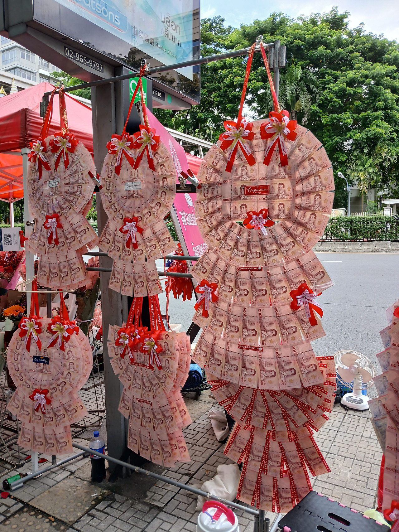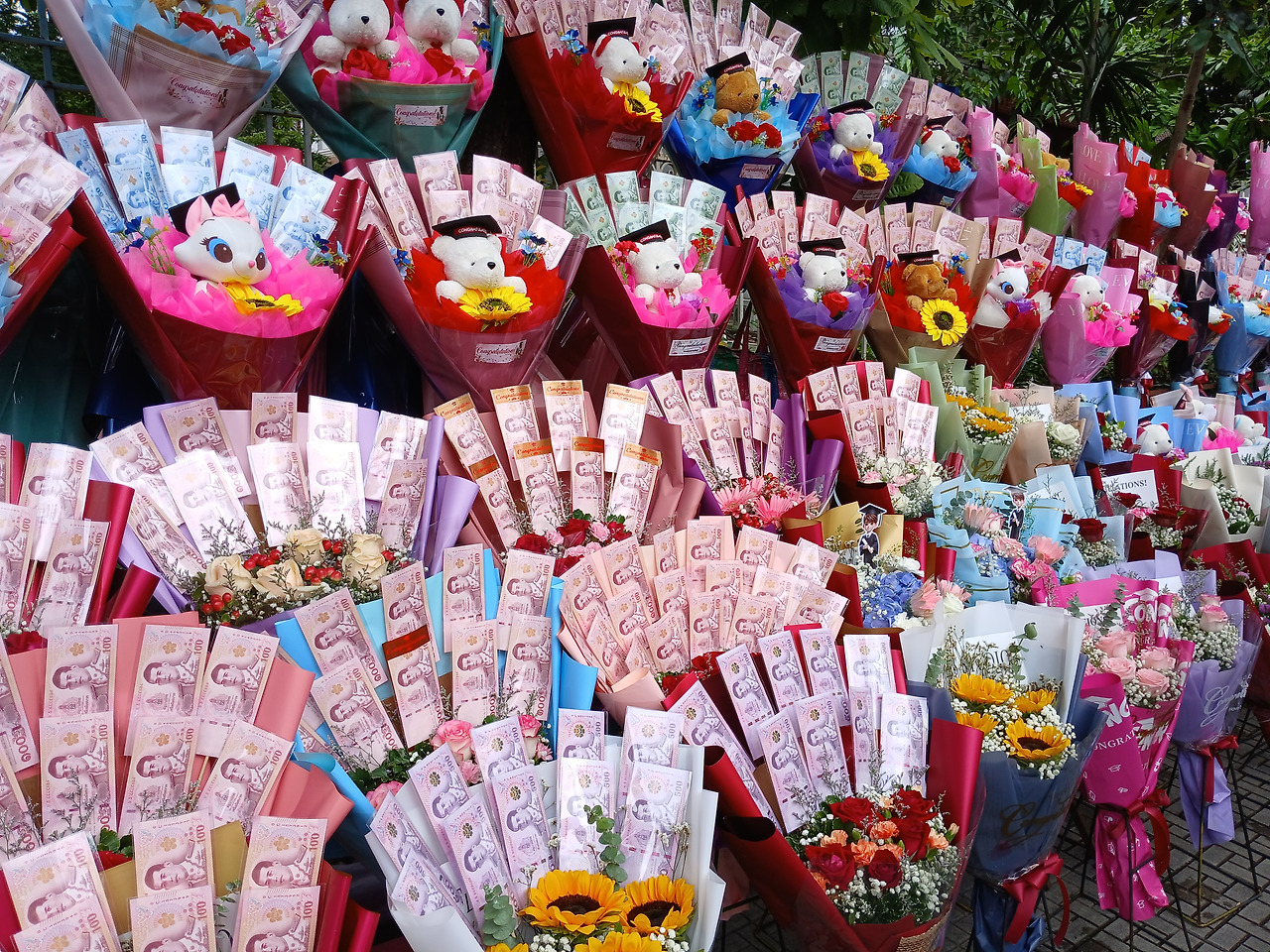 입구 앞에는 알록달록한 꽃다발과 돈다발을 파는 자판들이 길게 늘어서 있었다.