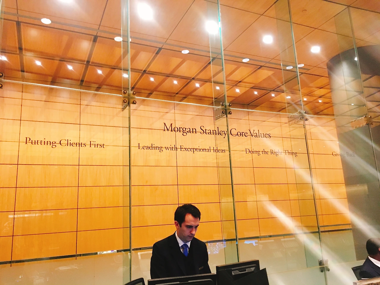 밟길을 옮긴 곳은 브로드웨이에 있는 모간스탠리 본사. 이곳을 찾을 때마다, Reception Desk 뒤에 쓰여져 있는, 이 회사의 핵심 가치가 눈길을 끈다.