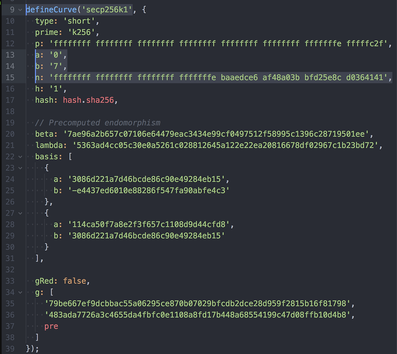 드래그 한 부분만 봐주시면 됩니다. a값이 0, b 값이 7, 그리고 n 값이 엄청나게 큰 숫자로 정의되어있으며, 그 곡선에 대해서 'secp256k1' 이라는 이름으로 정의(define)했다는 코드입니다.