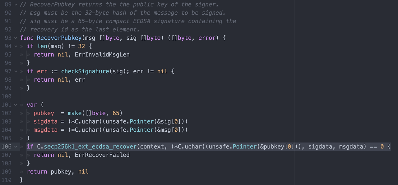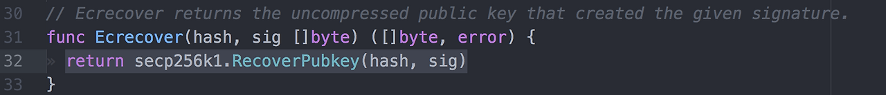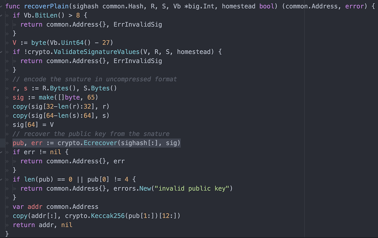 5-10. crypto/types/transaction_signing.go에 있는 recoverPlain 함수가 호출되면서 crypto/signature_cgo.go의 Ecrecover 함수를 호출합니다.