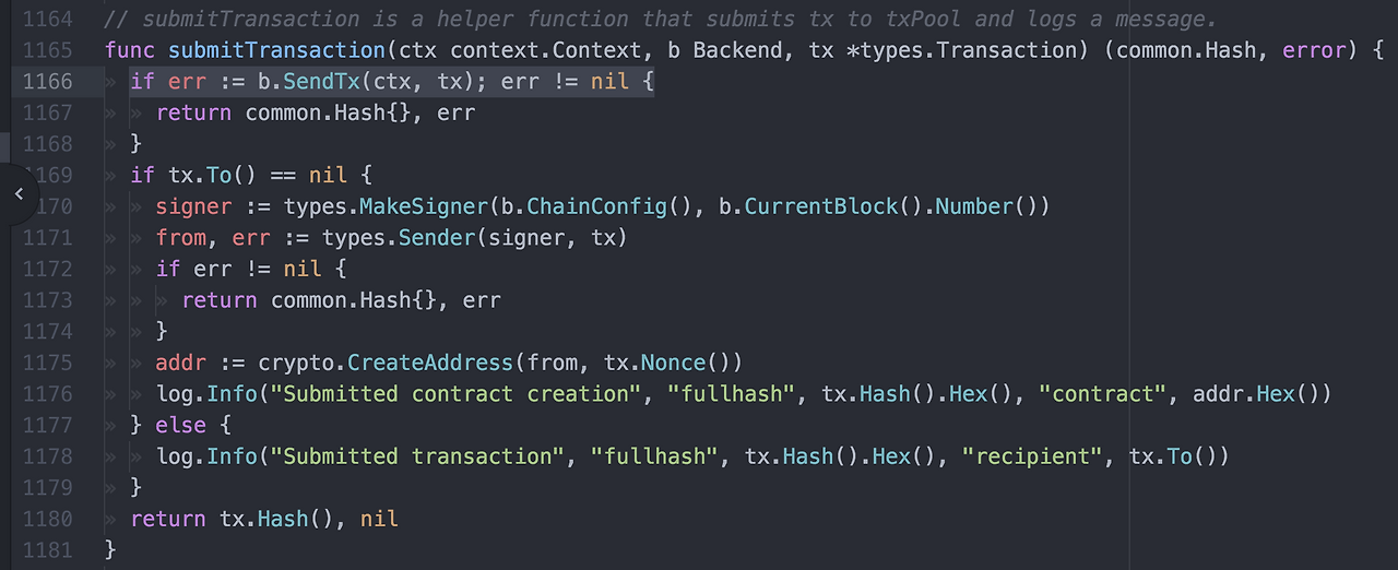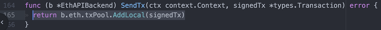 5-2. internal/ethapi/api.go의 submitTransaction 함수가 호출되면서 eth/api_backend.go의 SendTx 함수를 호출하게 된다.