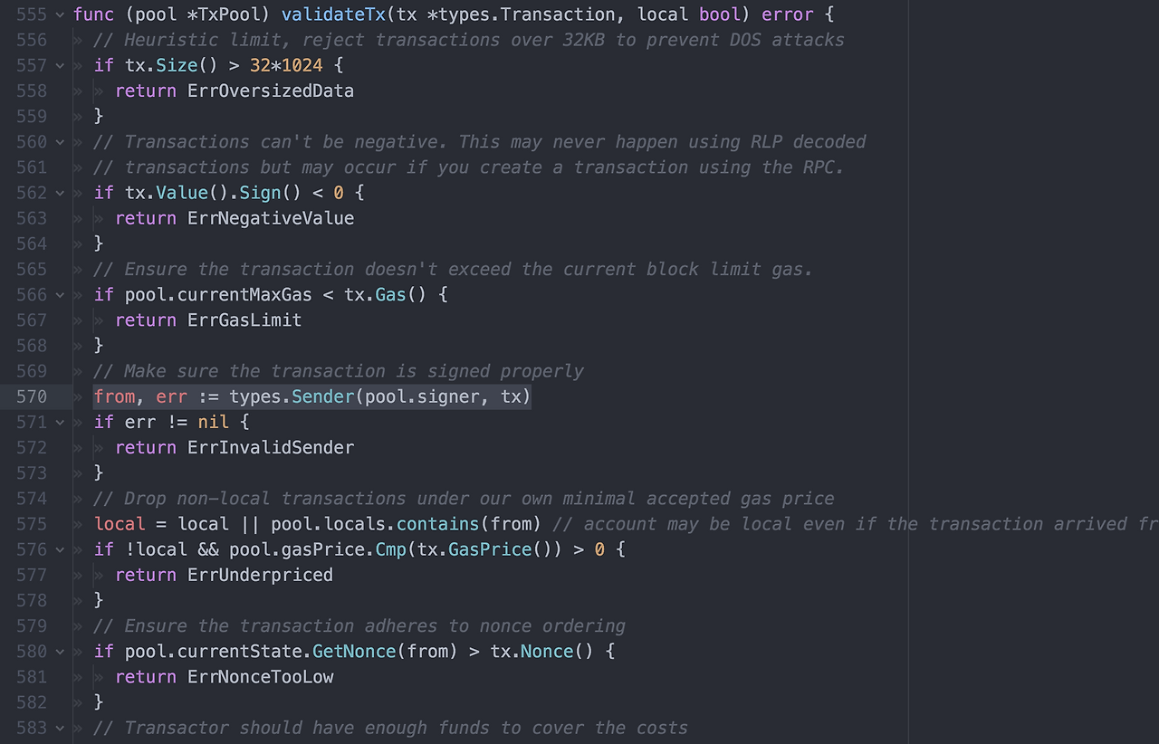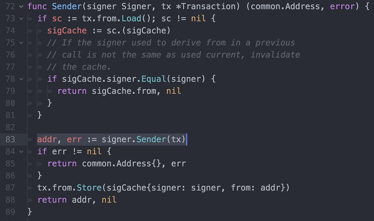 5-7. core/tx_pool.go의 validateTx 함수가 호출되면서 crypto/types/transaction_signing.go의 Sender 함수를 호출합니다.