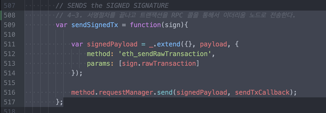 4-3. 서명절차를 끝내고 트랜잭션을 RPC 콜을 통해서 이더리움 노드로 전송한다.