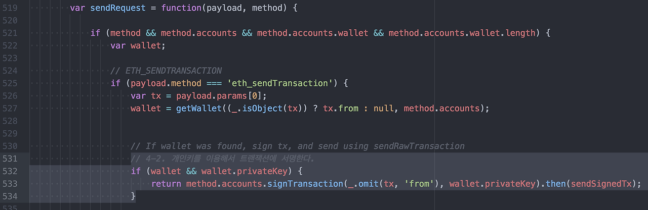 4-2. 개인 키를 이용해서 트랜잭션에 서명한다. (코드의 깊이에 따라 설명하다보니 순서가 뒤바뀌었는데, 서명하면서 3.서명 r, s를 만든다 에서 보여드렸던 그 코드를 실행하게 됩니다.)