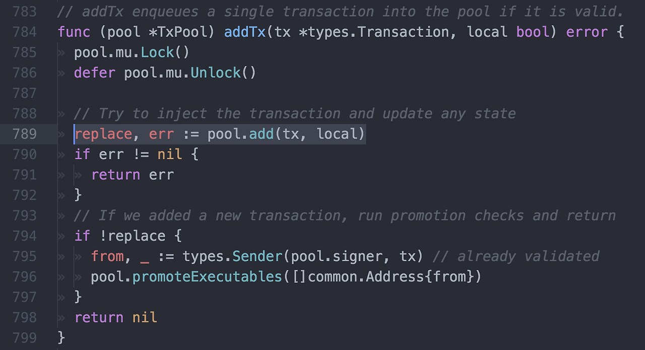 5-4. core/tx_pool.go의 AddLocal 함수가 호출되면서 core/tx_pool.go의 addTx 함수가 호출된다.