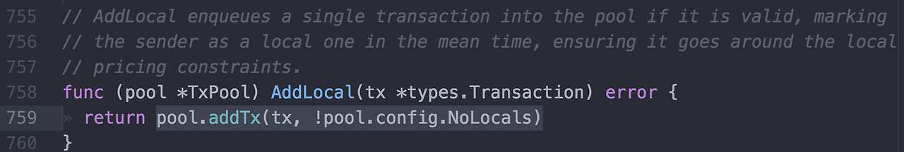 5-3. eth/api_backend.go의 SendTx 함수가 호출되면서 core/tx_pool.go의 AddLocal 함수를 호출하게 된다.