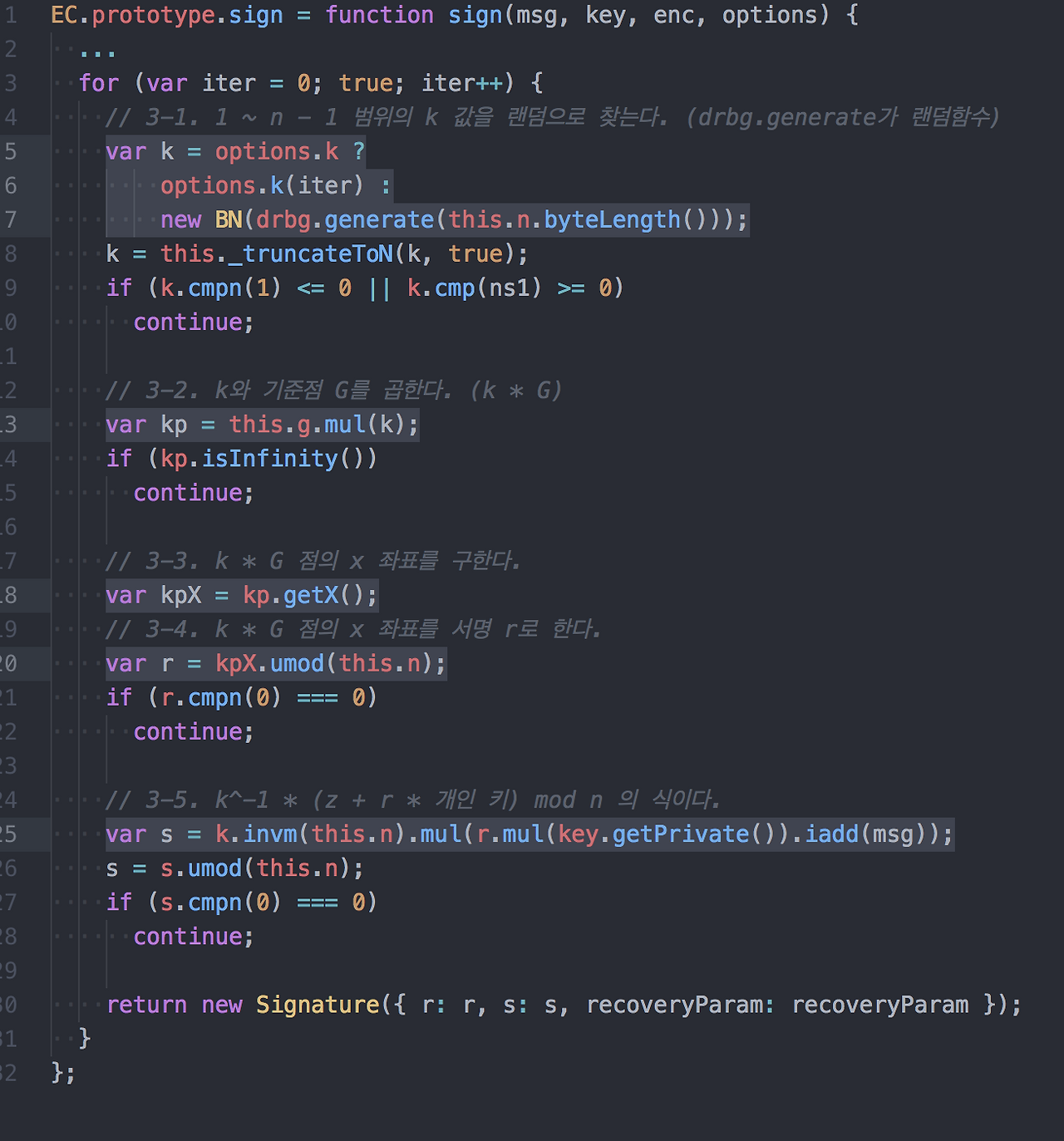 드래그 되어서 하이라이트 되어있는 부분들과 주석만 보시면 됩니다. k는 랜덤한 값을 뽑아낸다고 하였는데, 드래그 되어있는 영역 세번째 줄을 보시면 drbg.generate라는 함수가 있습니다. 바로 이 값이 랜덤한 값을 뽑아주는 애입니다. 앞서 글에서 이 k 값은 개인 키와는 달리 우리가 직접 정하는 값이 아니라고 했었습니다. 바로 이렇게 컴퓨터에서 랜덤하게 뽑아서 줍니다.