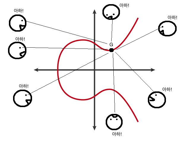 사실 이것을 하려면 송신자와 수신자, 아니 블록체인을 이용하는 모든 사용자들이 공통적으로 타원곡선위의 어느 한 점을 알고있어야 합니다. 바로 이 점을 타원곡선의 기준점(base point), G 라고 부릅니다.