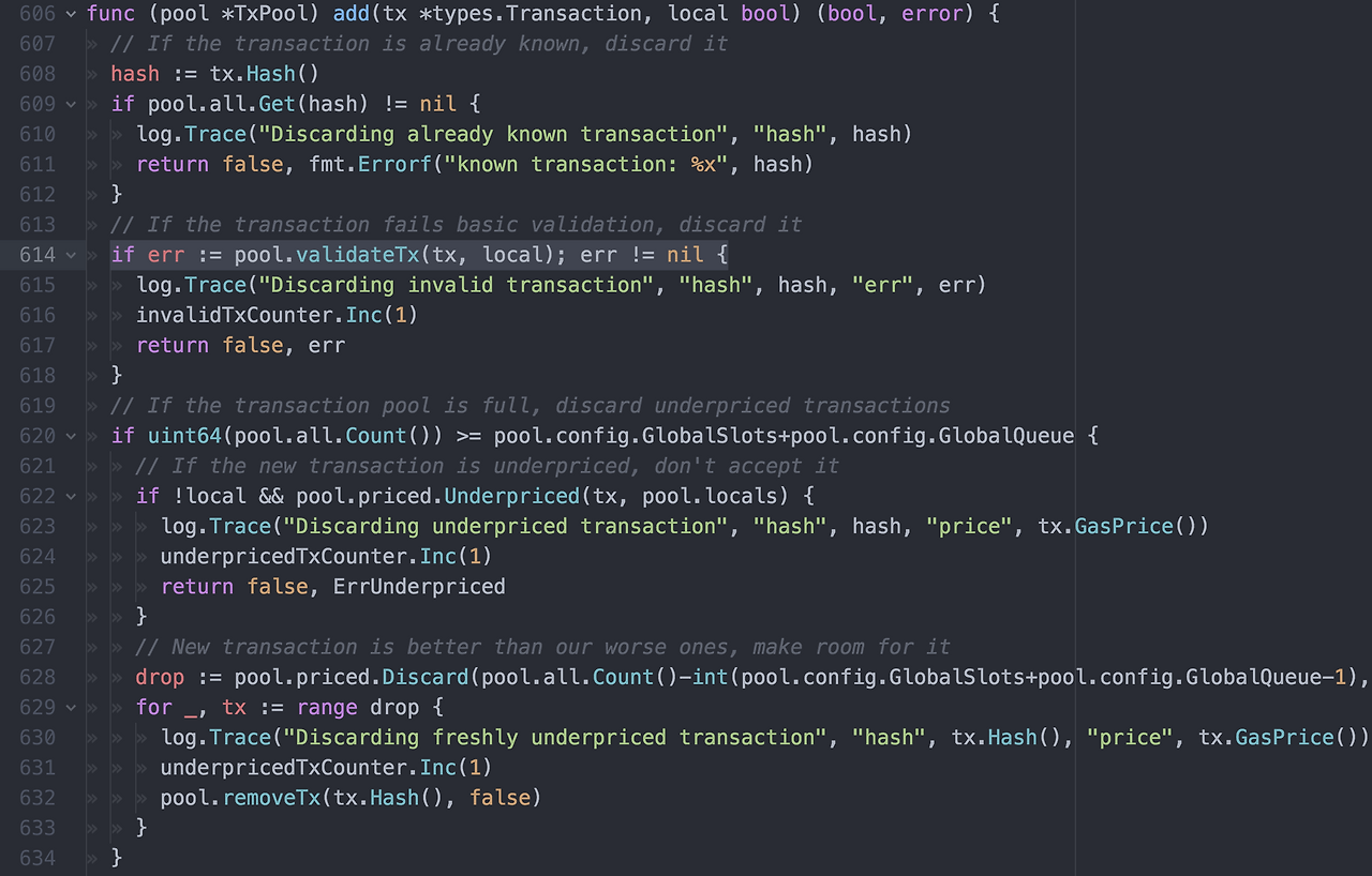 5-5. core/tx_pool.go의 addTx 함수가 호출되면서 pool.add 함수를 호출합니다.