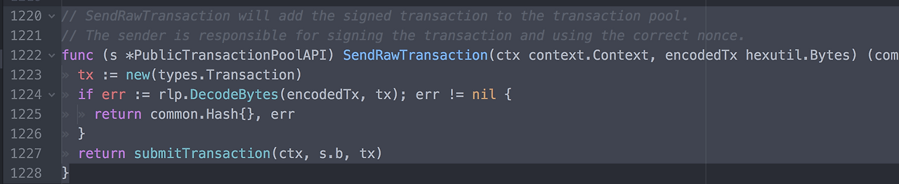 5-1. web3에서 날린 RPC 콜(eth_sendRawTransaction)을 통해 트랜잭션을 전송하면서, 전송된 트랜잭션 데이터와 함께 go-ethereum의 internal/ethapi/api.go의 SendRawTransaction 함수가 호출되게 된다.