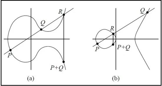얘네들을 잇는 직선을 쭉 긋고, 나머지 교점 (R) 의 x축대칭을 시키게 되면 그 점이 바로 P+Q의 점입니다.