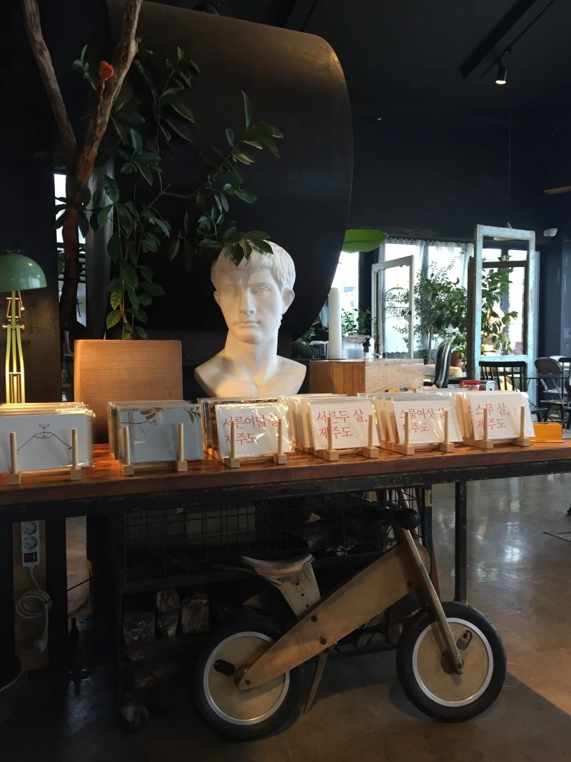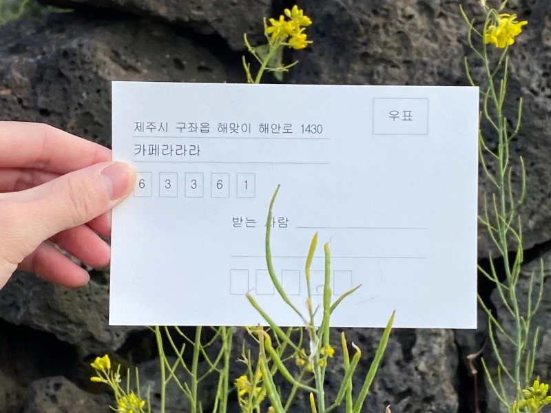 제주는 기온은 높아도 바닷바람 때문에 날씨는 꽤나 추웠다. 한참을 걸었더니 춥기도 하고 좀 쉬고 싶기도 해서 눈앞에 '당근주스' 네 글자가 크게 써져 있는 카페로 들어갔다. 주문을 하고 진동벨이 울려 받으러 갔더니 당근주스를 시키면 엽서를 하나씩 준다고 써서 우체통에 넣으란다. 주소로 보내주는 것 같은데, 한참이나 앉아 있었는데도 무슨 말을 써야 할지 떠오르지 않아서 주소만 적은 채 그대로 가방 깊숙이 집어넣고는 보내지 않았다.