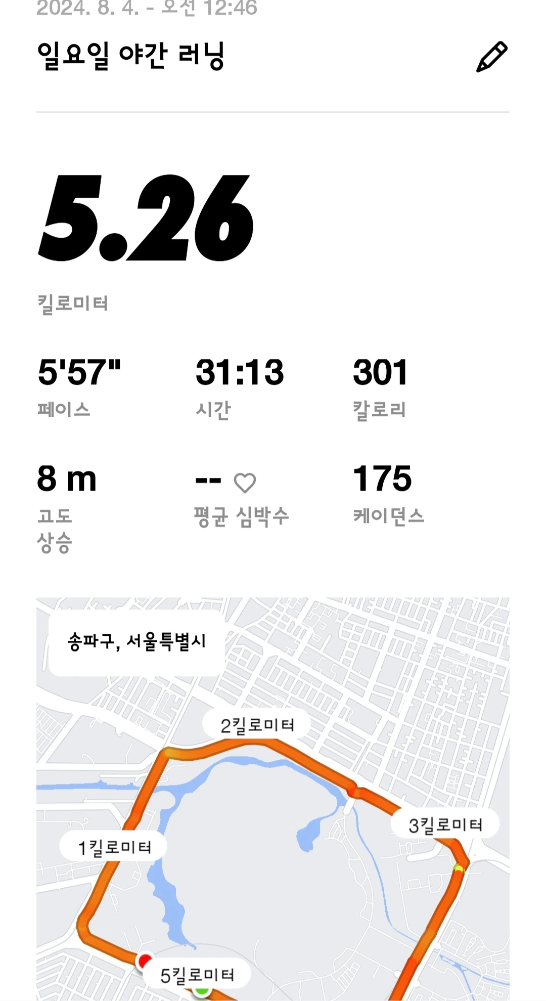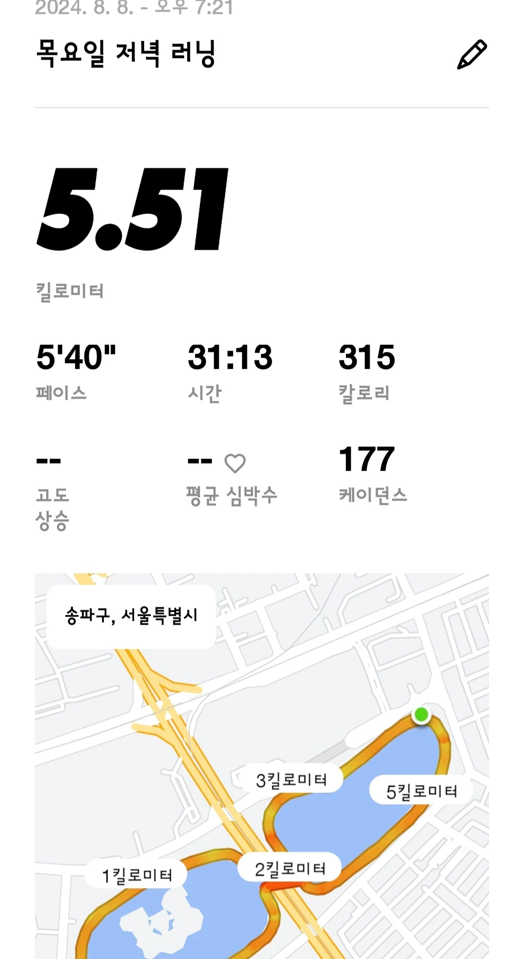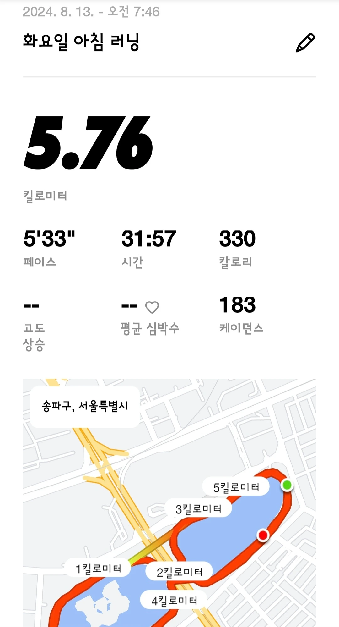 최근 부서에 가급적 자주? 한 번 뛸 때 3킬로 이상 뛰고 인증을 올리는 카카오* 방이 생기면서 그 단톡방에 들어가면 조금이라도 더 열심히 뛰게 되지 않을까란 생각에 초대를 부탁하여 들어갔다. 7월 말쯤 들어가서 현재까지 10건의 러닝을 인증했으니 나름 나의 의도가 통하고 있는 것 같다. 페이스는 차치하고라도 날마다 뛰는 거리를 조금이라도 더 늘려보려 했는데 5.76킬로미터를 뛴 날 이후로, 남편과 함께 달리느라, 비가 금방이라도 쏟아질 것 같아서 등등의 핑계들로 다시 러닝거리가 줄어들었다..... 역시 쉽지 않은 건 사실이다.