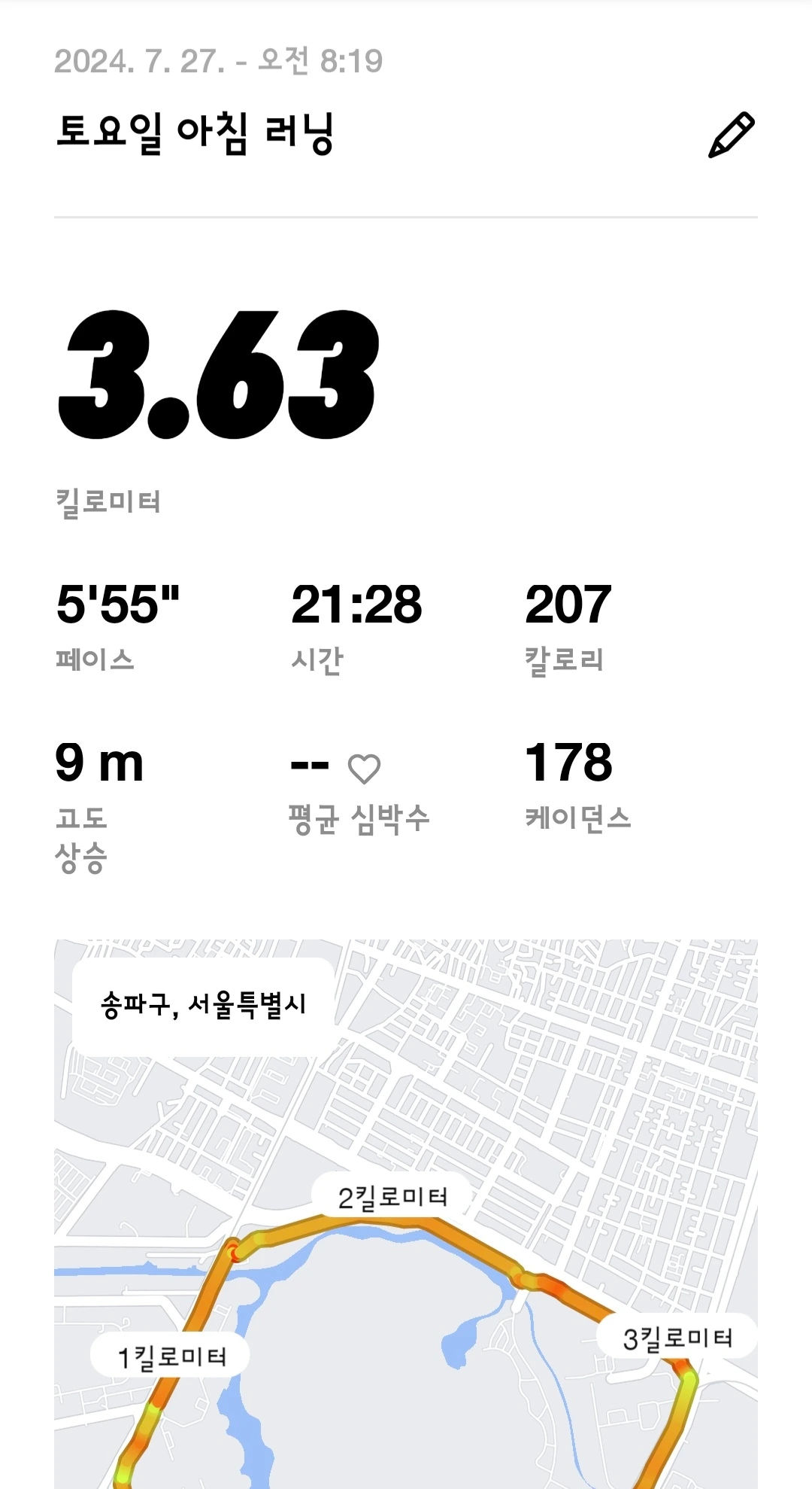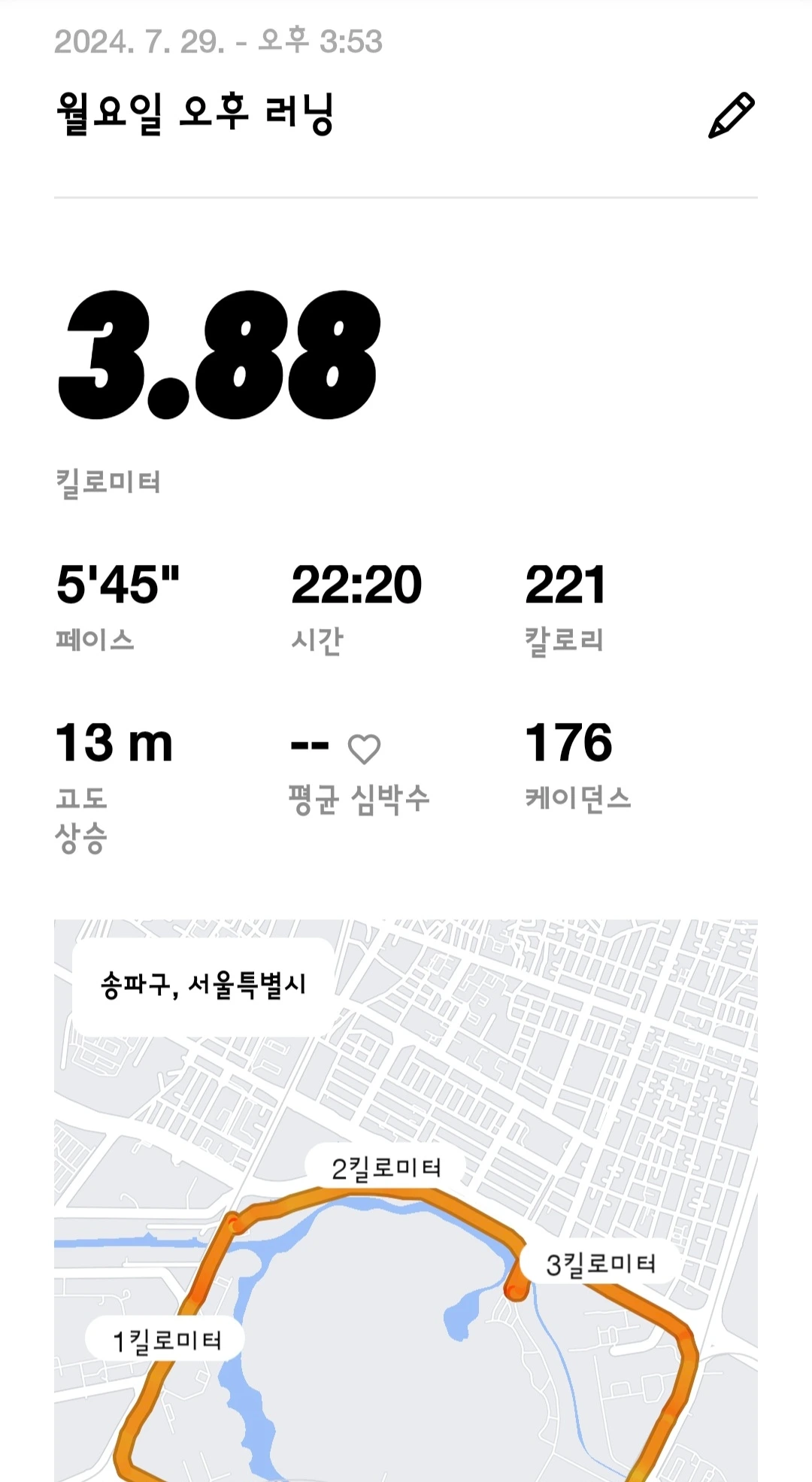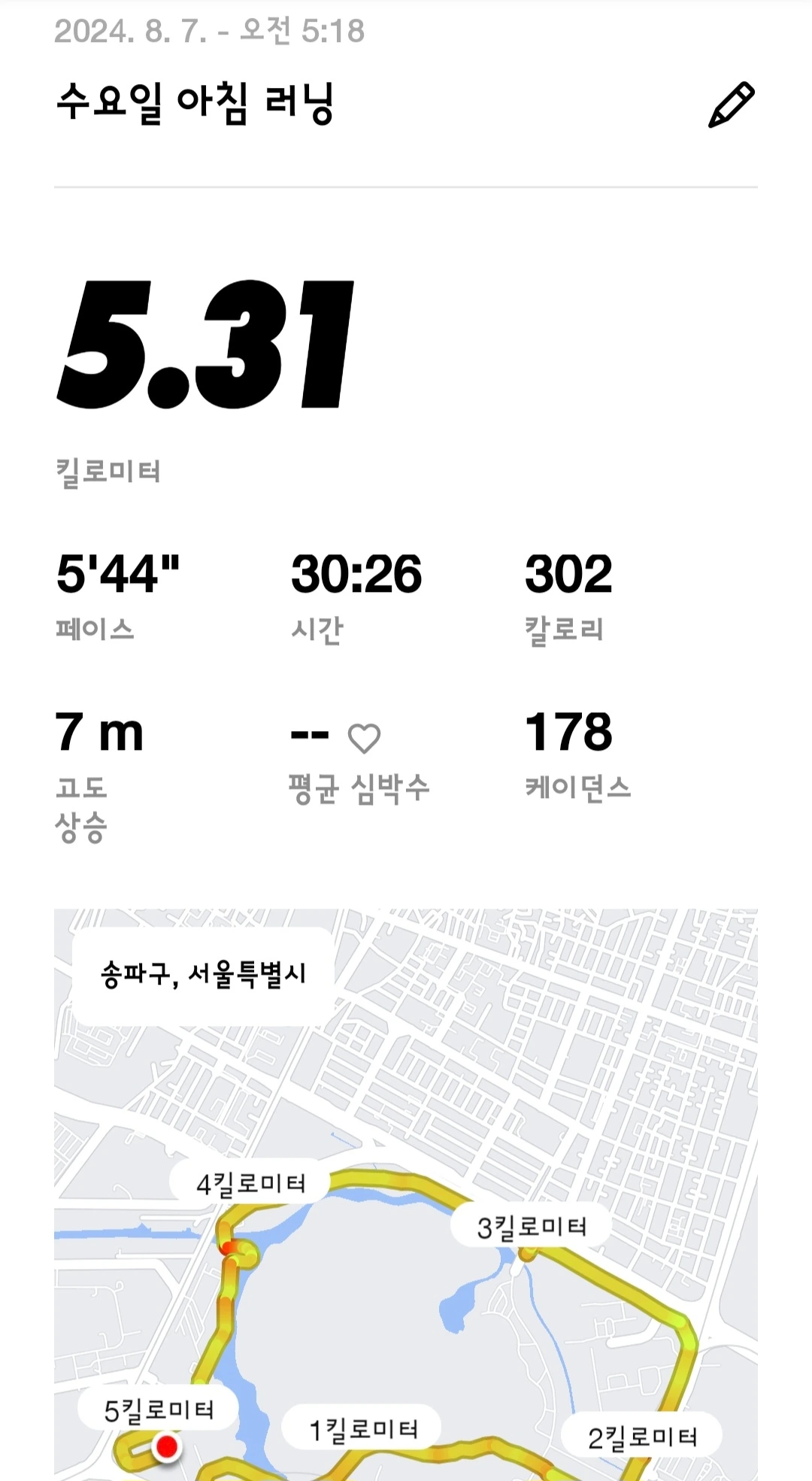 최근 부서에 가급적 자주? 한 번 뛸 때 3킬로 이상 뛰고 인증을 올리는 카카오* 방이 생기면서 그 단톡방에 들어가면 조금이라도 더 열심히 뛰게 되지 않을까란 생각에 초대를 부탁하여 들어갔다. 7월 말쯤 들어가서 현재까지 10건의 러닝을 인증했으니 나름 나의 의도가 통하고 있는 것 같다. 페이스는 차치하고라도 날마다 뛰는 거리를 조금이라도 더 늘려보려 했는데 5.76킬로미터를 뛴 날 이후로, 남편과 함께 달리느라, 비가 금방이라도 쏟아질 것 같아서 등등의 핑계들로 다시 러닝거리가 줄어들었다..... 역시 쉽지 않은 건 사실이다.