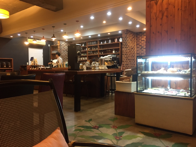 주차 공간이 있는 꽤 넓은 매장이다. 차에서 내려 바라보는 커피집 외관에서 느껴지는 분위기가 좋았다. 밖은 깜깜 안은 훤한, 좌우로 환하게 젖혀지는 접이식 문이 열려 있어 더 그렇지 않았을까. (밤이어서 더 느낌이 좋았을 수 있다.) 나무 느낌을 살린 따스한 빛의 커피집이었다. 내부로 들어오면 조명이 더욱 밝은 카운터가 눈에 들어온다. 그 뒤로는 벽면을 가득 채운 커피 기구들이 조명에 반짝이고 있어 커피집을 기대하는 마음을 충족시켜주는 곳이다. 다양한 커피 기구와 컵들을 전시해 두어 보는 재미가 있다. 원두를 직접 판매하고 있었다. 무엇보다 파티션 역할을 하는 나무 책장이 멋스러움을 더하고 있다. 책이 인테리어가 되는 세상이 이런 건가, 하고 생각했다. 전체적으로 조화가 있는 공간이다. 나무결이 살아나는 느낌이 드는 곳이랄까.