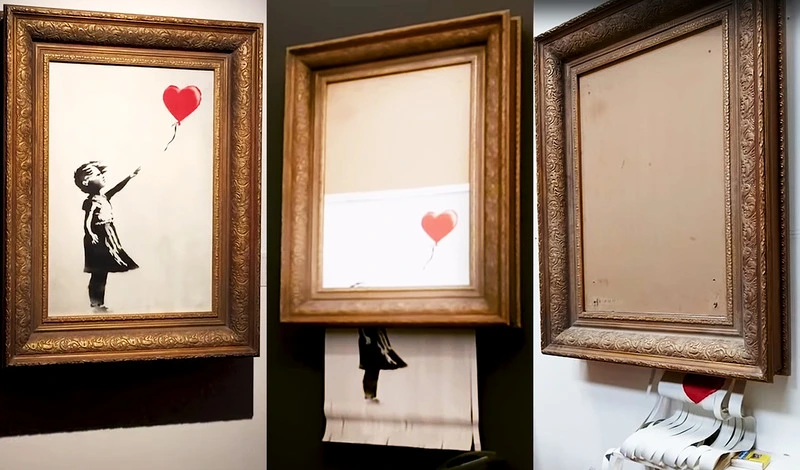 재미난 것은 이런 비판적이고 풍자적인 뱅크시의 작품이 매우 높은 가격에 거래되고 있다는 사실이다. 허물어져가는 동네 담벼락에 그린 그의 그림은 그 집주인에겐 로또나 다름없다. 이에 담벼락 그림을 지키기 위해 경호원을 고용하는 웃지 못할 일이 벌어지기도 했다. 백미는 2018년 10월 영국 소더비 경매에 나온 <풍선과 소녀>라는 작품이다. 무려 104만 파운드(약 14억 원)에 판매된 이 그림은 낙찰된 순간 액자 틀에 숨겨진 소형 분쇄 장치가 가동되면서 그림의 절반이 파쇄기에 잘린 듯 가늘게 잘렸다. 아이러니하게도 이 역시 뱅크시의 퍼포먼스로 밝혀지면서 그 자체로 하나의 예술 작품으로 남았다.