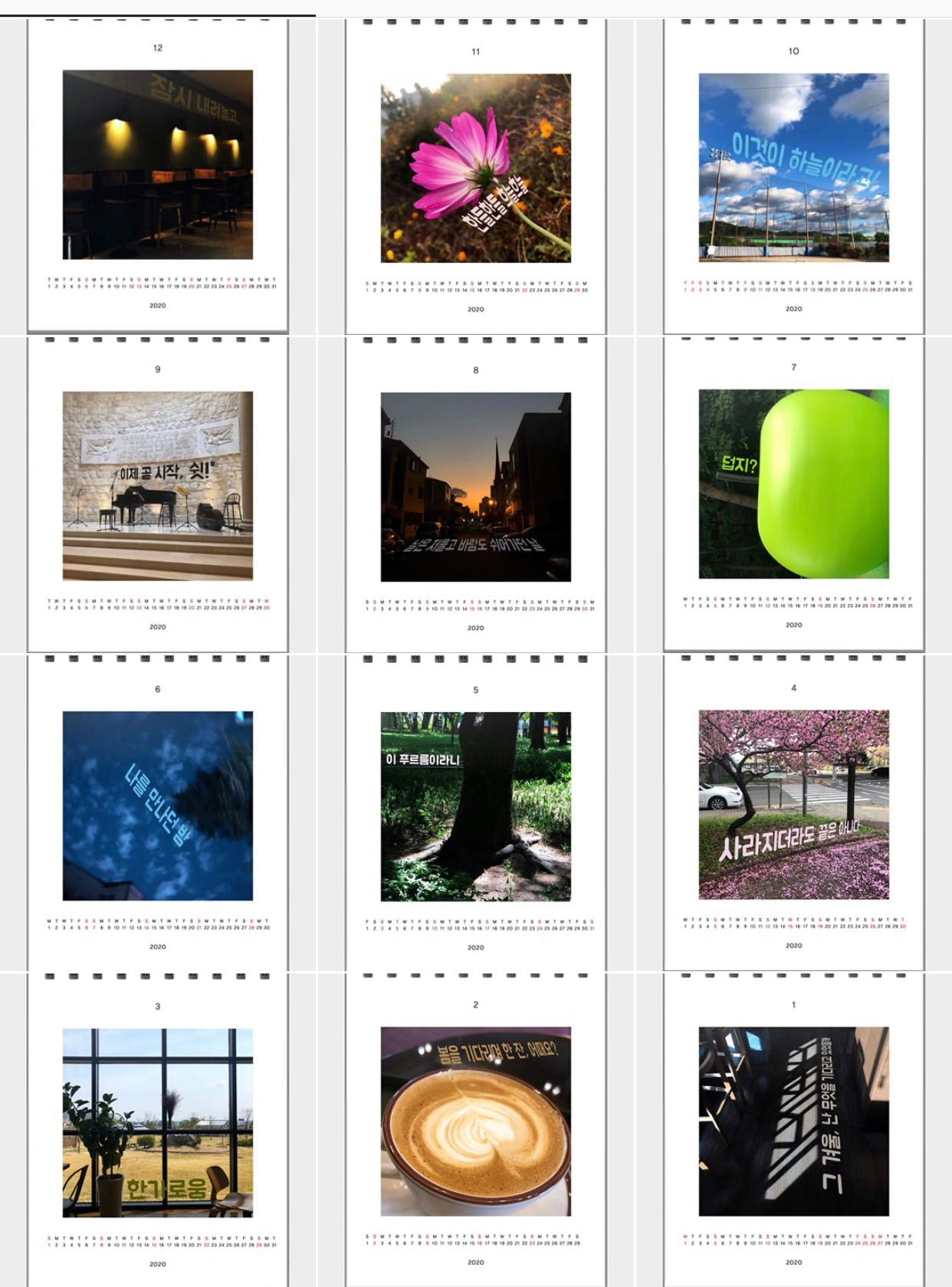 올해엔 사진에 넣는 글을 둥글둥글하게 3차원적으로 표현해 봤다. 조금 날것의 텍스트보다는 조금 다듬어진 이미지로 대체해 봤다. 이번이 여덟번째. 2022년이면 10번째 에디션이 탄생한다. 언젠가 이 달력으로 나의 자그마한 전시회를 여는 날을 기다리며.