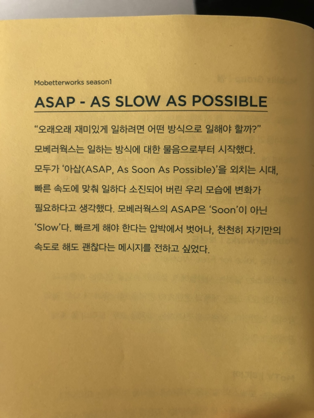 이 책은 '모빌스'라는 회사에서 '모베러웍스'라는 브랜드를 만들고, 자신들이 '일하는 방식'에 대한 과정들을 '모티비'를 통해 펼쳐놓은 '과정들'을 담았다. 이 책의 첫 부분을 참고한다면 간단히 이해할 수 있다. 회사를 설립하고, 브랜드를 제작하고, 이를 통해 사람들과 소통하기까지의 고민들이 있어 자신만의 일을 찾고 창업을 하고자 하는 사람들에게 영감을 줄 수 있다. 무엇보다 최근의 트렌드를 잘 담고 있다.