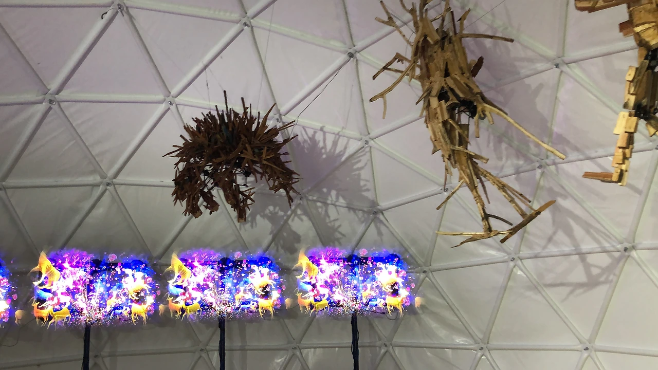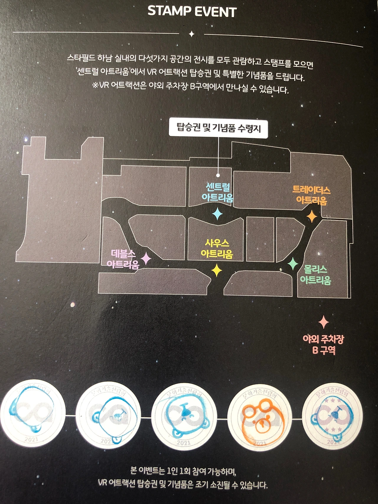 실내에는 총 다섯 개의 전시장을 돌아볼 수 있도록 구성하였는데, 그 시작은 22m 높이의 대형 미디어 타워이다. 물론 다섯 개 전시장 어디에서 출발해도 상관은 없다. 이 다섯 개의 전시장을 돌며 도장을 찍고, 다시 미디어 타워로 돌아오면 선물도 준다. 그리고 여기에서 야외 전시장의 VR 체험 전시 티켓을 받아 주차장에 설치된 야외 전시장으로 향하면 그곳에서 커다란 돔 형태의 VR 체험 기구가 보인다. 스타필드가 워낙 커서 전시장을 돌아보는 데에도 꽤 많은 시간이 걸렸다.