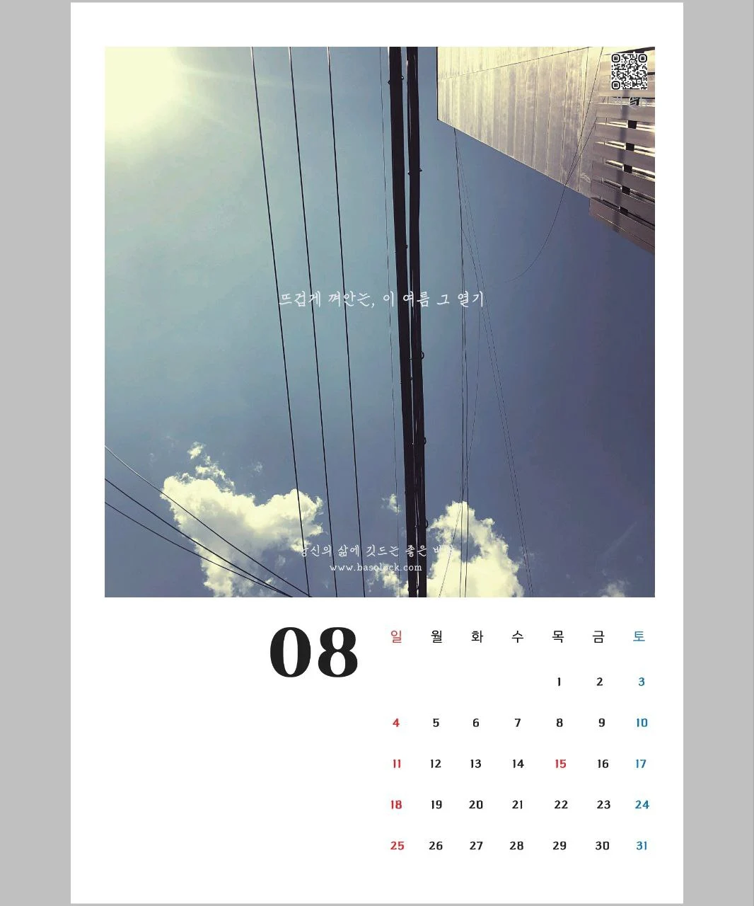 뜨겁다. 하늘도 뜨겁고 땅은 타오른다. 갑갑한 공기 속에서 찾을 수 있는 위안은 에어컨 아니면 아이스 커피 정도. 이 사진은 특별함은 없다. 전형적인, 이곳저곳에서 자주 볼 수 있는 사진 소재와 구도이다. 건물 사이로 지나는 전깃줄이 하늘을 훑으며 지나고 있다.