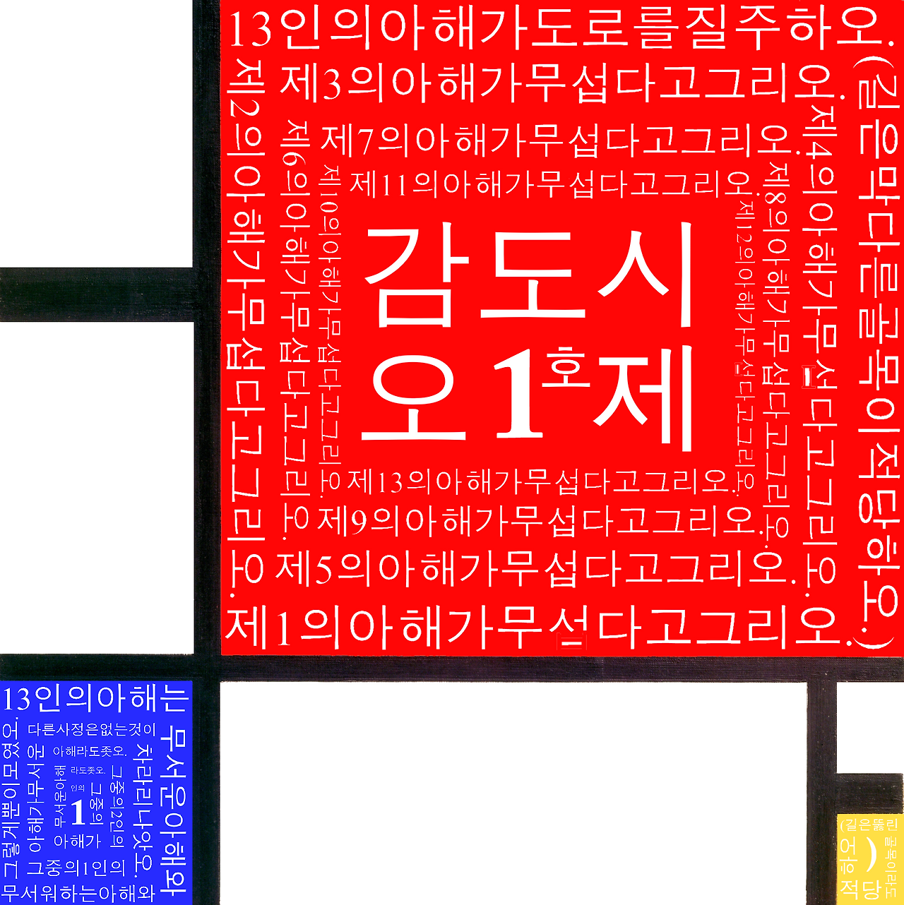 도로를 질주하는 아해를 따라, 길게 뻗은 문장을 달리는 아해를 따라, 글자와 글자 사이를 지그재그로 뛰어가는 아해를 따라, 막다를 길에 내몰린 아해를 따라, 이곳을 벗어날 수 없는 두려움에 가득 찬 아해를 따라, 그 뒤를 따르는 또 다른 아해를 따라, 그렇게 반복되는 아해를 따라, 이 반복이 끝없을지 이어질지 모른다는 막막함에 이르러, 그리고 끝이 없다는 문장이 주는 무한에 대한 두려움에 이르러, 몬드리안의 이상에 다다라.