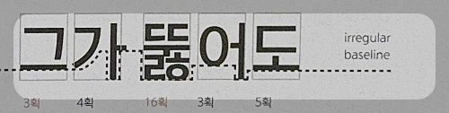종성 유무가 혼재되어 베이스라인의 변화가 심한 국문 세벌체 같은 경우 이러한 현상이 특히 강하게 나타난다.
