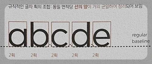 알파벳: 'abcde'처럼 단위 면적당 선의 양이 일정하며 고르게 나열된다.