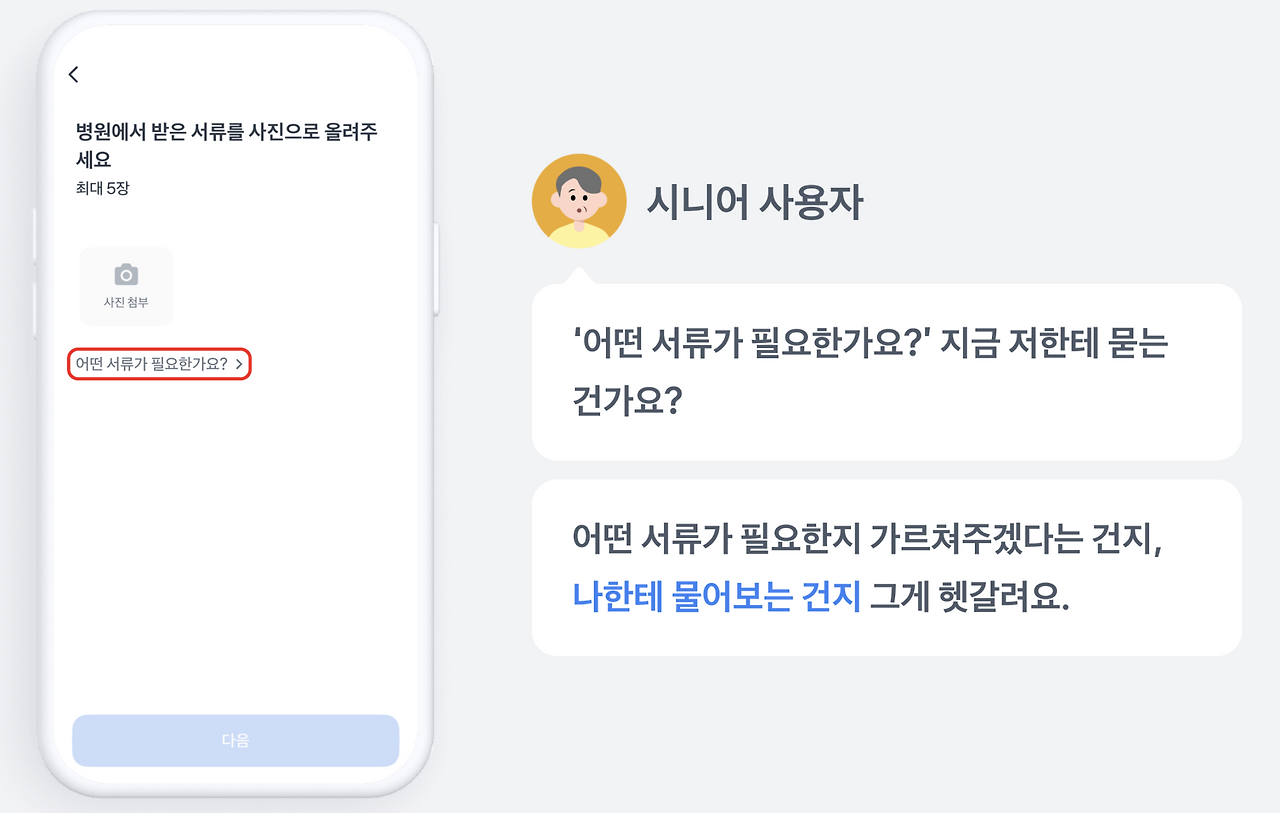대부분의 사용자들은 ‘어떤 서류가 필요한가요?’라는 질문형 텍스트를 통해 '필요한 서류를 안내받을 수 있다'는 점을 떠올렸지만, 일부 시니어 사용자들은 질문의 주체를 명확하게 이해하지 못하고 ‘나에게 질문한다’라고 문장 그대로 받아들여 혼란스러워했습니다.