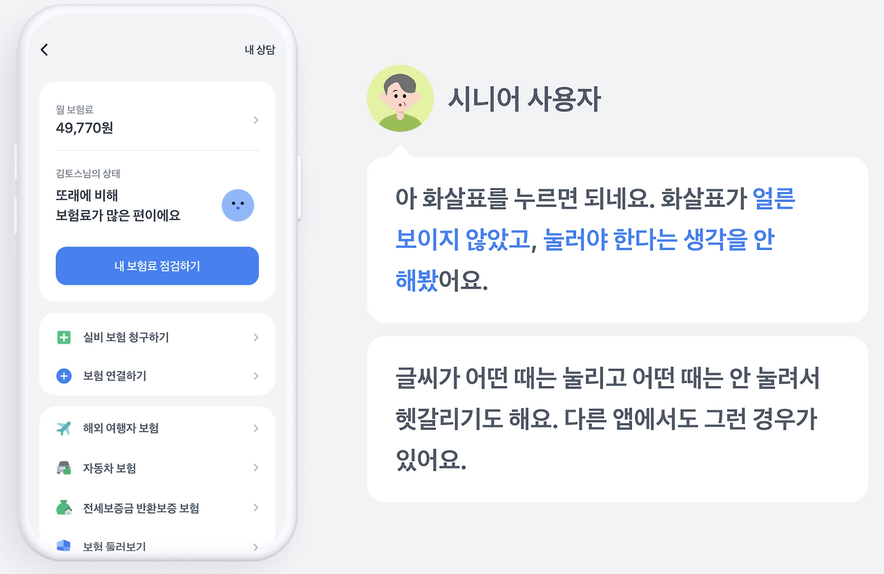 따라서, 다른 연령대의 사용자들이 보편적으로 쉽게 인지하고 이해하는 요소들도 시니어에게는 많은 불편함을 줄 수 있을 것 같습니다.
