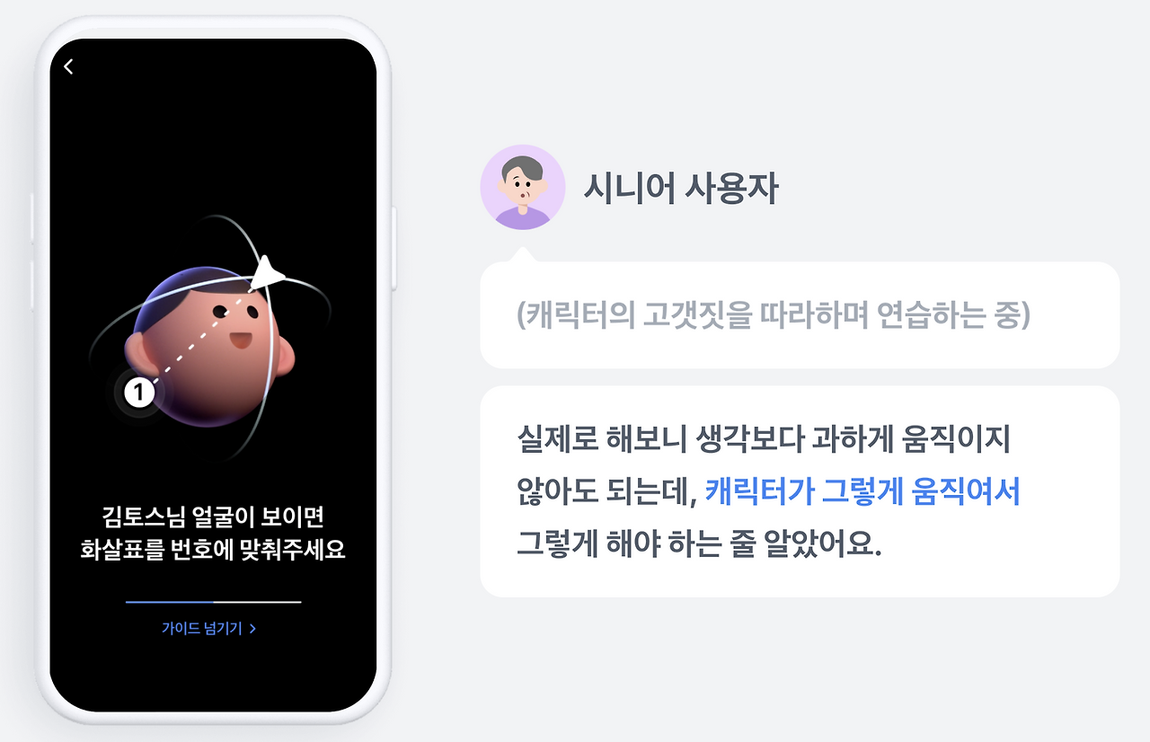 ‘얼굴 등록’이라는 생소한 서비스를 마주했을 때 긴장한 시니어들이, 문구보다 주목도가 높은 예시 캐릭터를 100% 동일하게 따라 해야만 등록에 성공할 수 있다고 생각했던 겁니다.