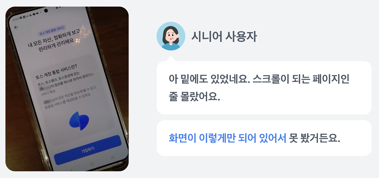 반면, 일부 시니어 사용자들은 하단의 추가 콘텐츠가 잘 드러나지 않으면 스크롤을 시도하지 않았습니다.