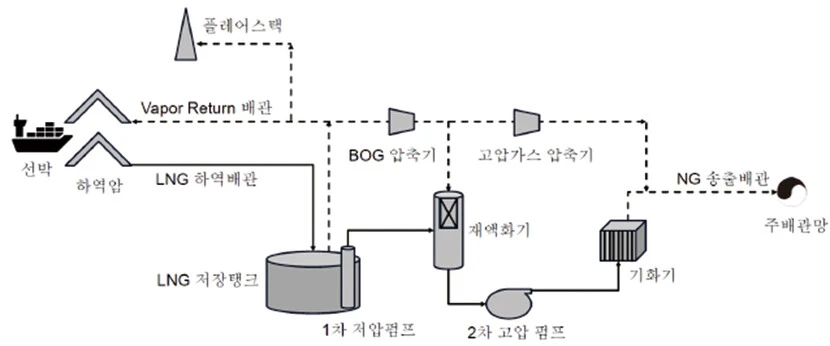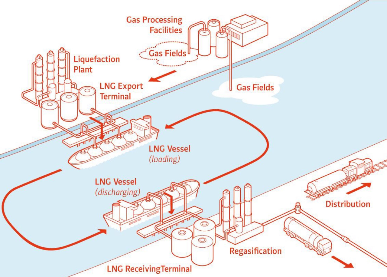 LNG를 수출입하려면 가스가 나는 곳에서 항구까지 파이프 라인을 만들고, 항구에는 천연가스를 압축해서 액체로 LNG로 만드는 터미널, 그리고 LNG를 운반할 LNG 운반선, LNG를 기화시킬 터미널이 필요하다.