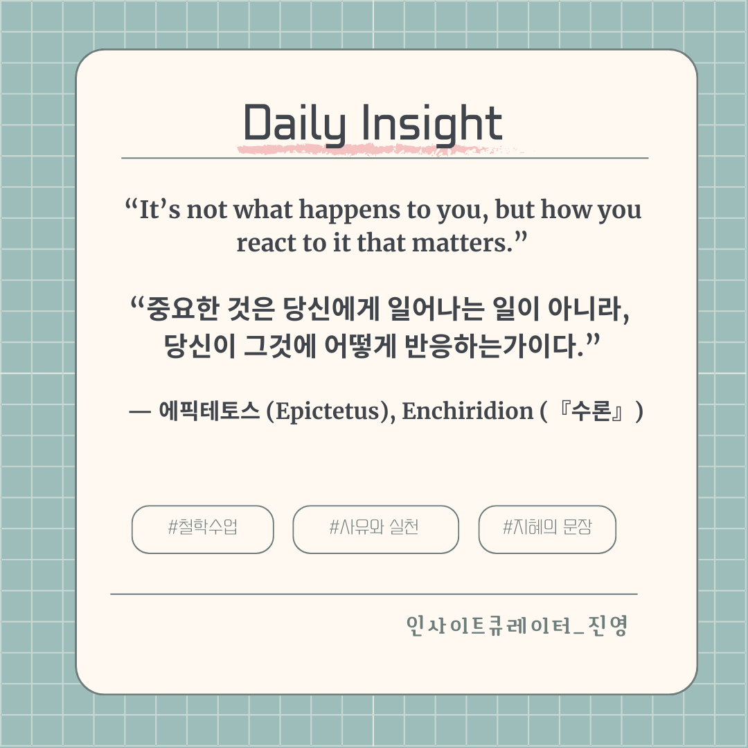 에픽테토스의 이 유명한 말은 2천 년이 지난 오늘날에도 여전히 우리에게 울림을 줍니다. 우리가 통제할 수 없는 상황 속에서도 내면의 평화를 유지할 수 있는 길을 제시하기 때문입니다.