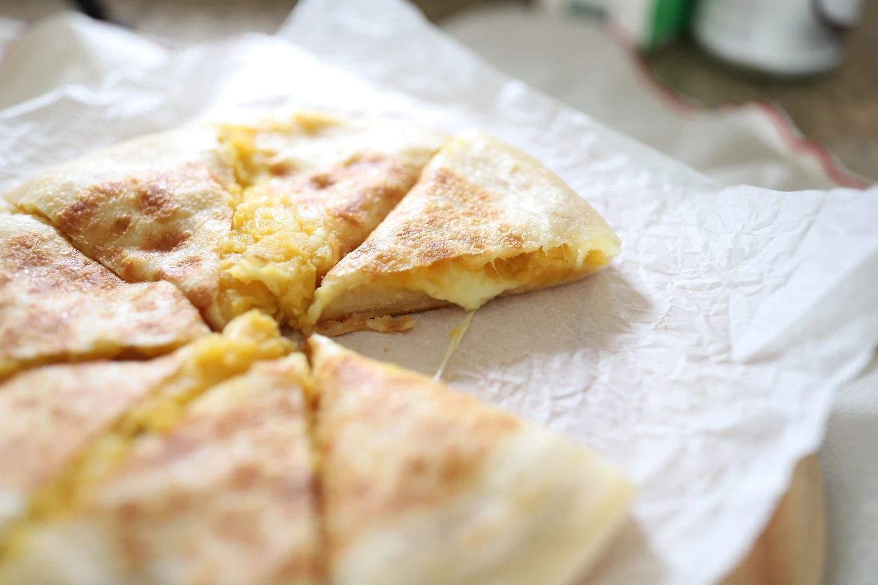 밀가루 반죽을 얇게 밀어 펴서 고구마와 치즈를 넣은 빵