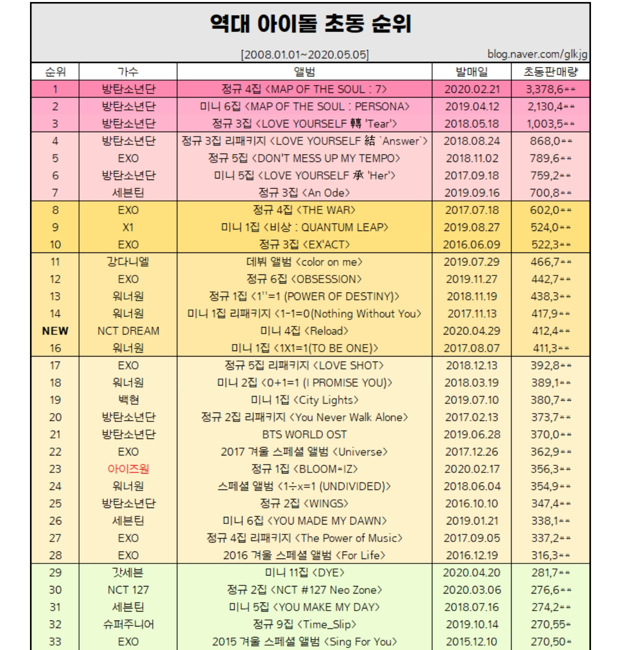 같은 시장 안에 있는 것 같지만 남돌과 여돌의 소비층에는 뚜렷한 차이가 있다. 이는 음반과 음원 판매량으로 어느 정도 유추가 가능하다. 2020년 5월 5일 기준 역대 앨범 초동 판매량(발매 후 일주일 동안의 판매량) 20위 안에 걸그룹은 없다. 50위 이내도 아이즈원(23위)뿐이고, 100위로 확대해야 트와이스, 블랙핑크, 아이유, 태연, 소녀시대의 이름을 찾을 수 있다. 200위까지 해도 추가되는 이름은 레드벨벳, 마마무, 문별, 에프엑스, 여자친구, 아이오아이가 전부다. 아이즈원 정규 1집이 초동 35만 장을 판매하기 전까지 걸그룹의 최대 판매량은 트와이스 미니 8집의 15만 장이었다. 참고로 통산 1위 방탄소년단이 초동 330만 장이다.