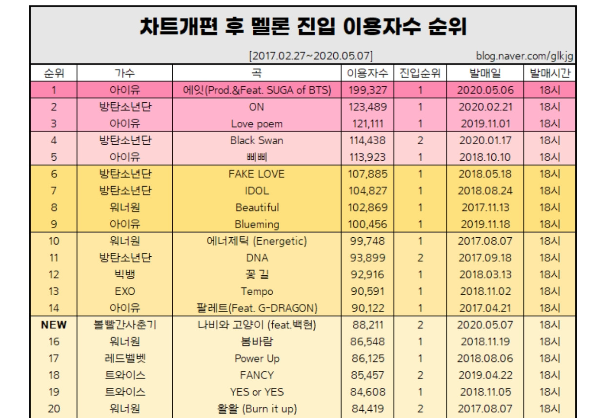 그런데 음원 성적을 보면 음반과 같은 심각한 쏠림 현상은 잘 발견되지 않는다. 멜론 진입 이용자 수(2017년 차트 개편 이후)를 살펴보면 20위 내에 남돌의 음원은 11곡, 여돌의 음원은 9곡이 있다. 가수로 따져봤을 때는 정확히 반반이다. 대체로 여돌은 음반에 비해 음원의 성적이 더 좋고 남돌은 그와 정반대의 경향이 나타난다.