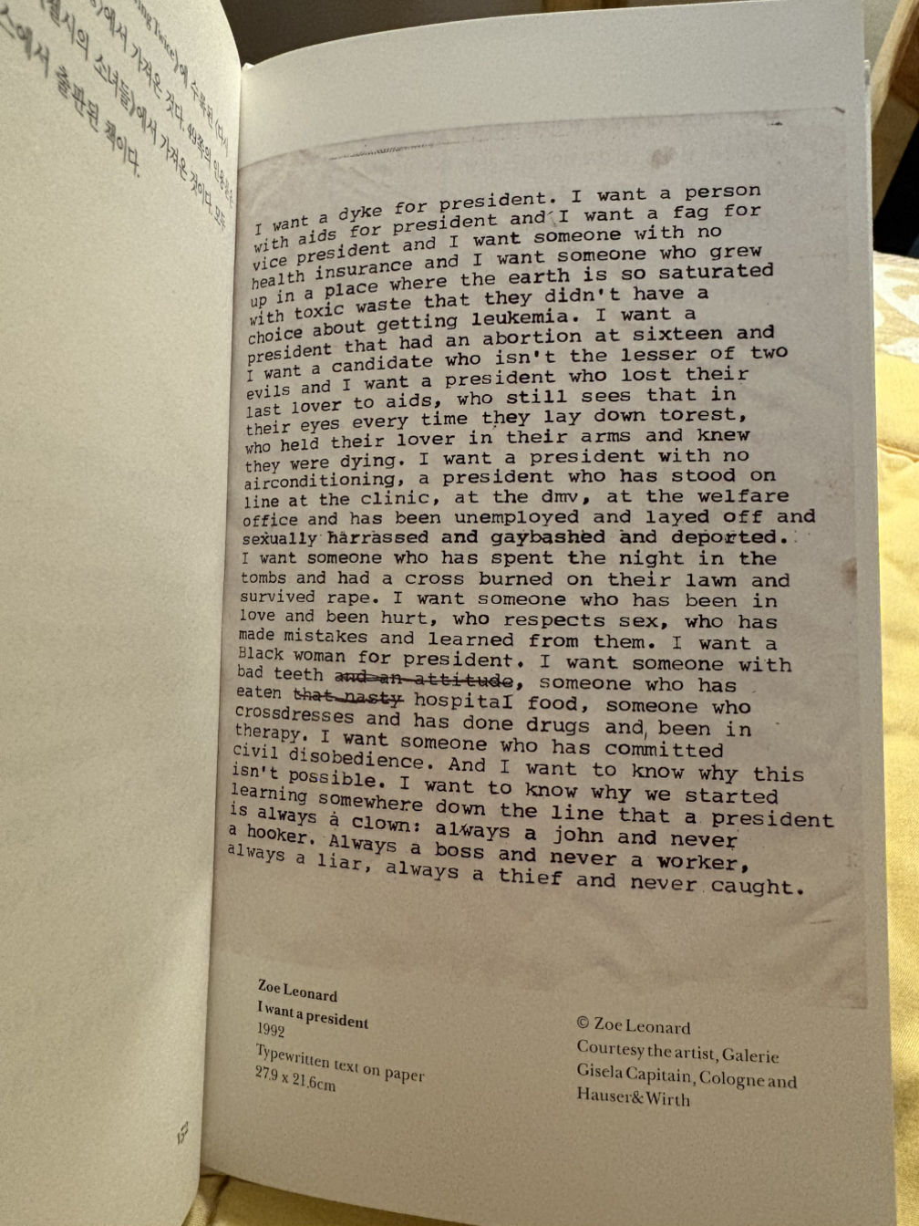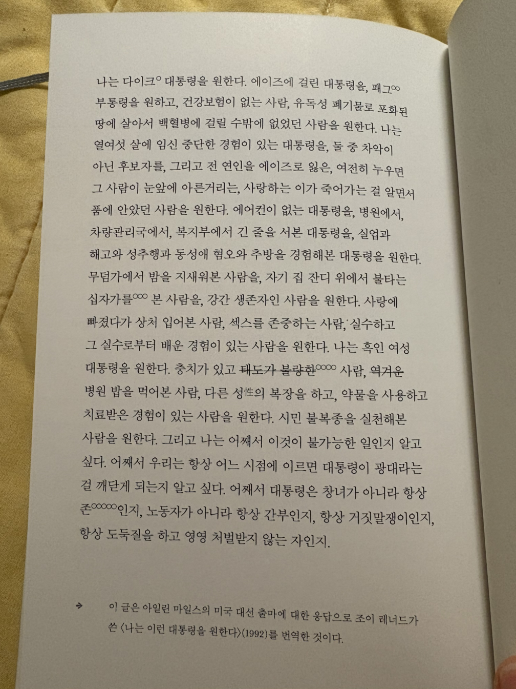 책은 김선오 시인의 서문으로 시작한다. 서문의 제목은 '불결한 삶을 베껴쓰기'. 나는 시인의 소개를 듣고서야 아일린 마일스라는 작가에 대해 알게 되었다. 1992년 미국 대선에 출마한 퀴어 시인이자 소설가, 컬트적 존재로 불리며 록스타 시인이라는 별명이 잘 어울리는 작가. 그녀는 대선 당시 '나는 이런 대통령을 원한다(I want a president)'라는 조이 레너드의 지지문으로 더 유명해졌는데, 아주 인상깊어 몇 번을 다시 읽었기에 이 글의 마무리에 붙이고자 한다. 다시 서문으로 돌아가, 김선오 시인 역시 아일린 마일스가 말하는 '쓰기' 행위에 대해 깊게 공감하고 있음을 알 수 있다. 그녀는 '쓰는 사람으로서의 자조와 수치를 유머러스하게 풀어내는 편이지만' 글쓰기에 대한 태도만큼은 분명하게 견지하고 있다. 표지에 쓰여 있는 다음 글귀가 그녀의 생각을 명확하게 보여주는 듯하다.