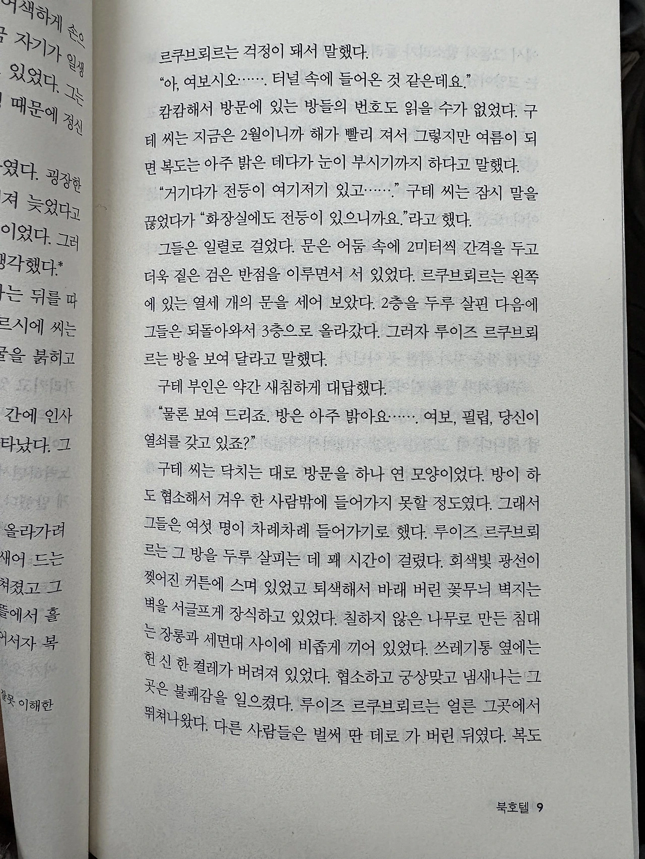 "캄캄해서 방문에 있는 방들의 번호도 읽을 수가 없었다. 구테 씨는 지금은 2월이니까 해가 빨리 져서 그렇지만 여름이 되면 복도는 아주 밝은 데다가 눈이 부시기까지 하다고 말했다. "거기다가 전등이 여기저기 있고...." 구테 씨는 잠시 말을 끊었다가 "화장실에도 전등이 있으니까요."라고 했다." (p.9)