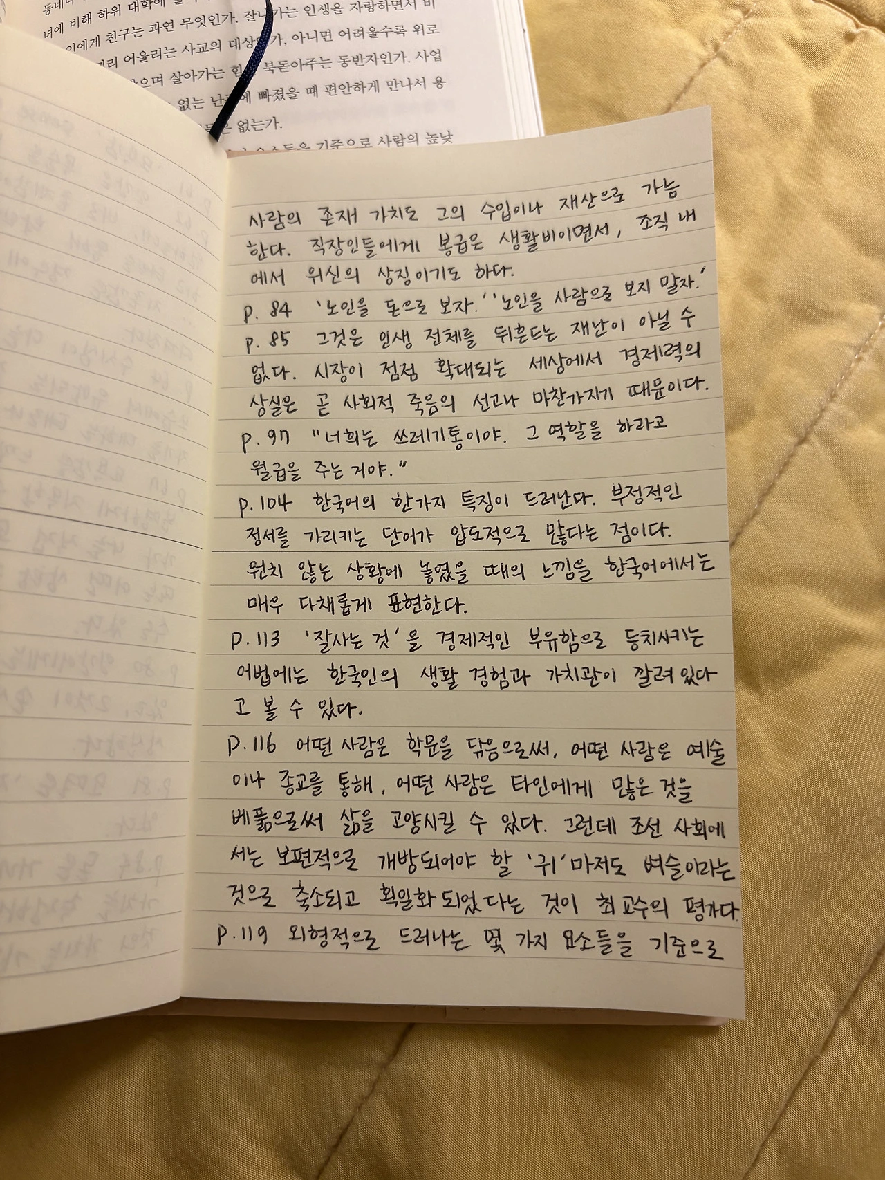 '우리 사회에서 우리의 값어치(남의 눈에나 자신의 눈에나), 사람의 값은 권력과 부와 지위에 의하여 정하여진다. 이것들은 우리 사회가 믿는 유일한 가치이다. 다른 한편으로 이러한 가치의 추구는 사회구조가 오만과 모멸의 구조로 되어 있기 때문에 불가피한 것이 되기도 한다. 오만과 모멸의 사회체계에서 가해지는 수모를 피하며 자존심을 유지하려면 최소한도의 부와 권력과 지위를 확보하여야 하는 것이다.' (p.135)