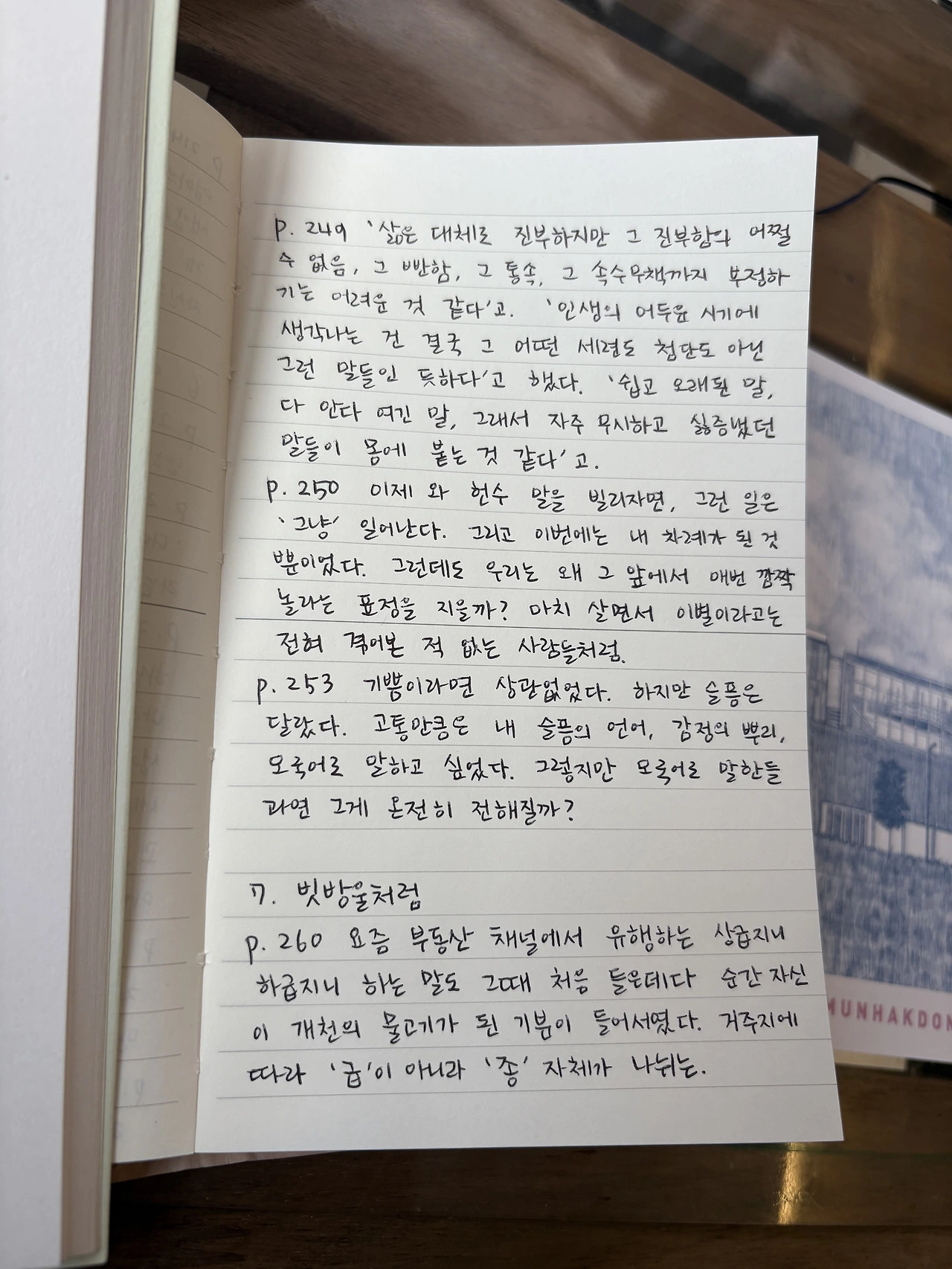 지금까지 화자의 발자취를 따라 시우네의 형편을 함께 동정해왔던 나는 무언가로 가슴을 깊이 찔린 것 같았다. 나보다 어려워보였던 사람이, 불쌍해보였던 누군가가 사실은 저 위에 서있었음을 깨달은 순간. 누가 누굴 감히 동정하겠는가. 하지만 그보다 훨씬 더 충격적인 것은 숨쉬듯 자연스럽게 위와 아래를 나누고 있었던 자신을 마주할 때였다. 그래서 오랜만이었다. 가슴에 통증이 일 만큼 깊숙이 찌르는 소설은. 그렇게 찔러놓고서는 내 눈을 가만히 들여다보는, 내 마음을 빤히 쳐다보는 듯한 글 말이다. 그리고는 되물어온다. "넌 어때? 넌 어떻게 생각해? 너도 그렇지? 영락없지?"