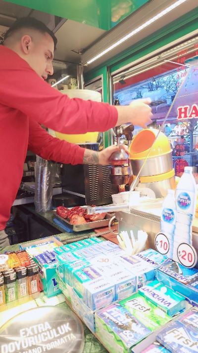 뚫어져라 쳐다보는 시선들이 부담스러워 어떤 가게도 들어가 보질 않았으니 주어진 40분마저도 남아돌게 되었다. 시장 입구를 빠져 나오니 석류주스를 파는 가게가 보였다. 튀르키예에서는 석류주스를 꼭 마셔봐야 한다는 정보를 사전 입수해 둔 터였다.