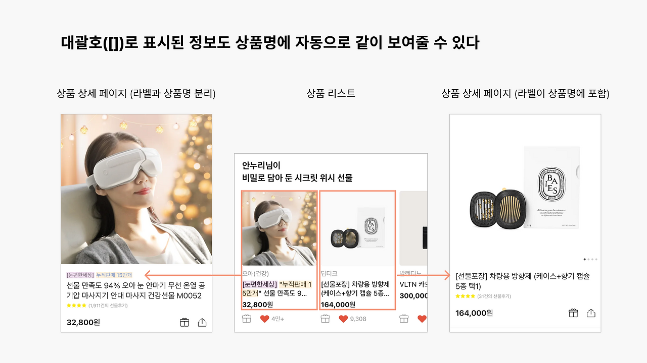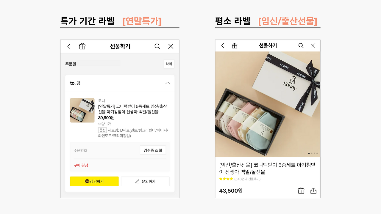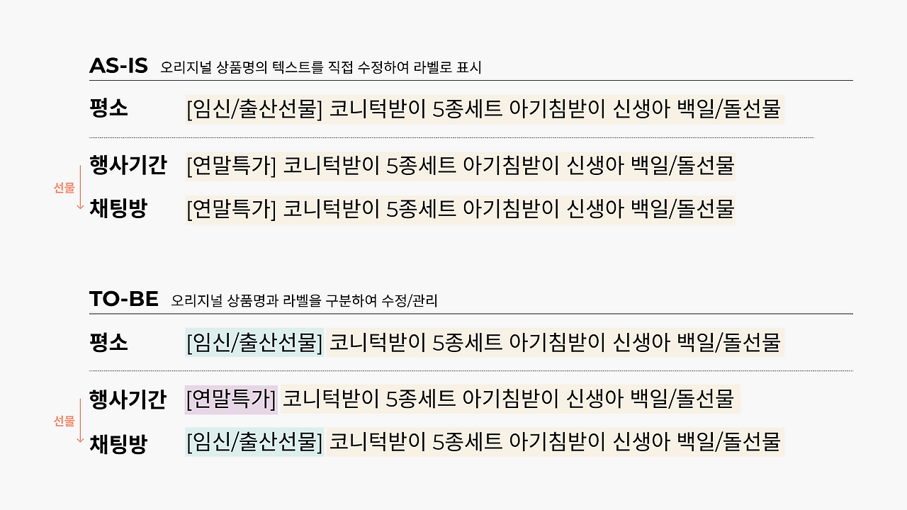 어떤 케이스에도 변하지 않는 내용을 오리지널 상품명으로 정의해놓고, 이와 별도로 선행하여 붙일 라벨을 케이스 별로 구분, 관리하는 것이다. 오리지널 상품명 앞에 평소에는 [임신/출산선물] 라벨이 달리게 하고, 행사기간에는 [연말특가] 라벨이 달리게 한다. 이렇게 구분되다 보면 행사기간 내 리스트 및 상세 페이지, 주문 내역에서는 [연말특가]를 포함한 상품명을 보다가도 선물한 친구와의 채팅방에서는 평소 라벨로 대체하여 보여준다.