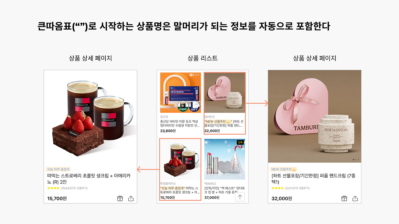 리스트에서 큰따옴표("")로 시작하는 상품명은 큰따옴표로 감싸진 텍스트가 진짜 상품명이 아닌 하나의 말머리로써 존재하는 것임을 상세 페이지에서 확인할 수 있다.