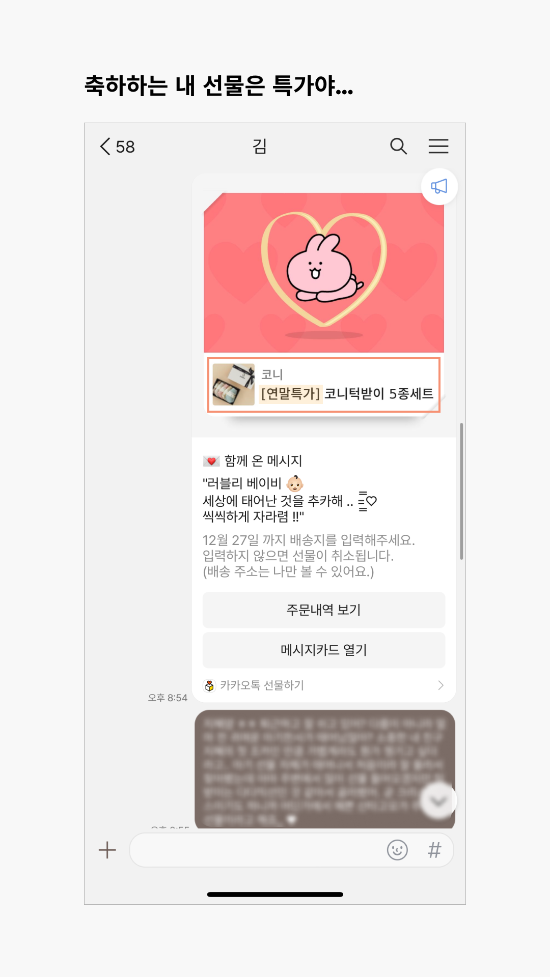 선물을 결제하고, 채팅방으로 바로 넘어가 준비했던 메시지도 바로 보낸 뒤 화면을 다시 보는데 아뿔싸.