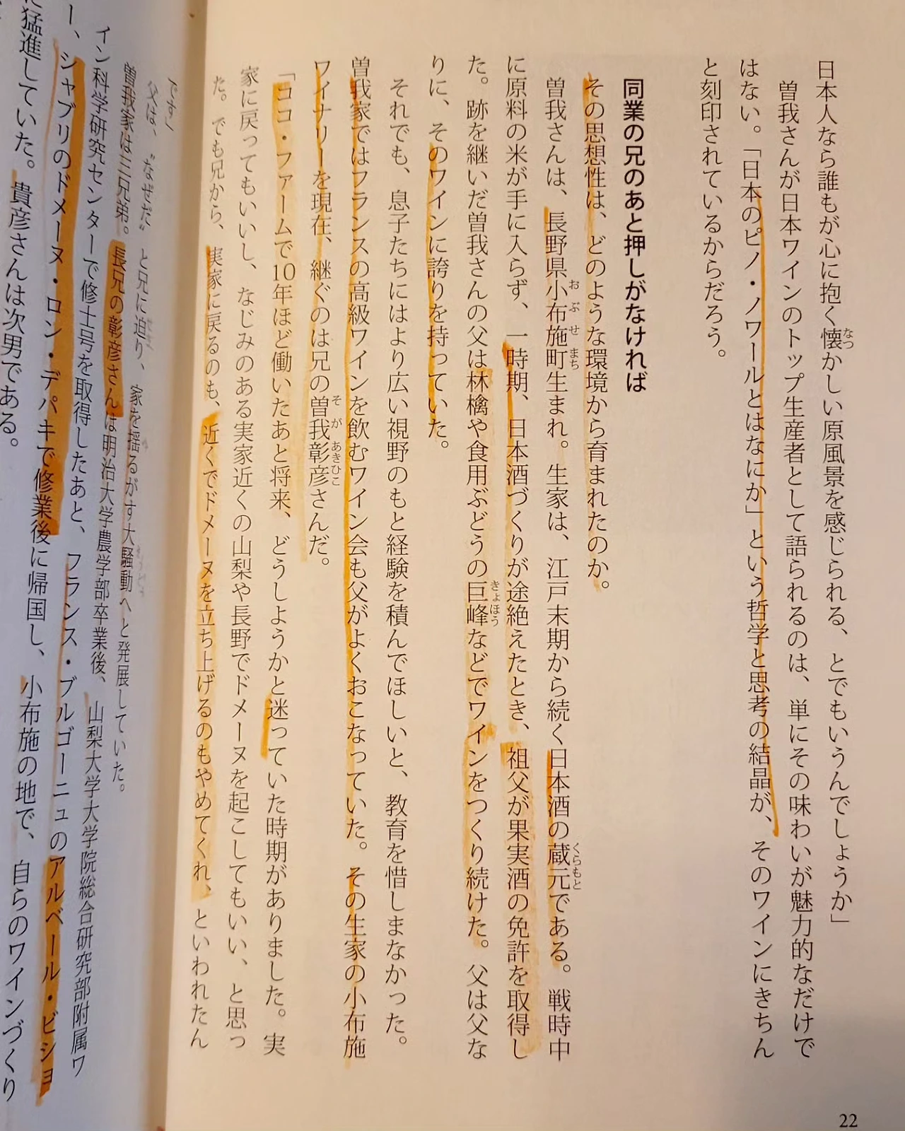 아키히코상은 메이지대학 농학부졸업,야마나시대학원 와인학과에서 공부후 프랑스 브루고뉴의 알베르비쇼, 샤블리의 도멘 론데파키등 연수후 귀국했다. 아키히코상은 아버지의 소망에 따라 니혼슈 양조도 지속적으로 하고있다.